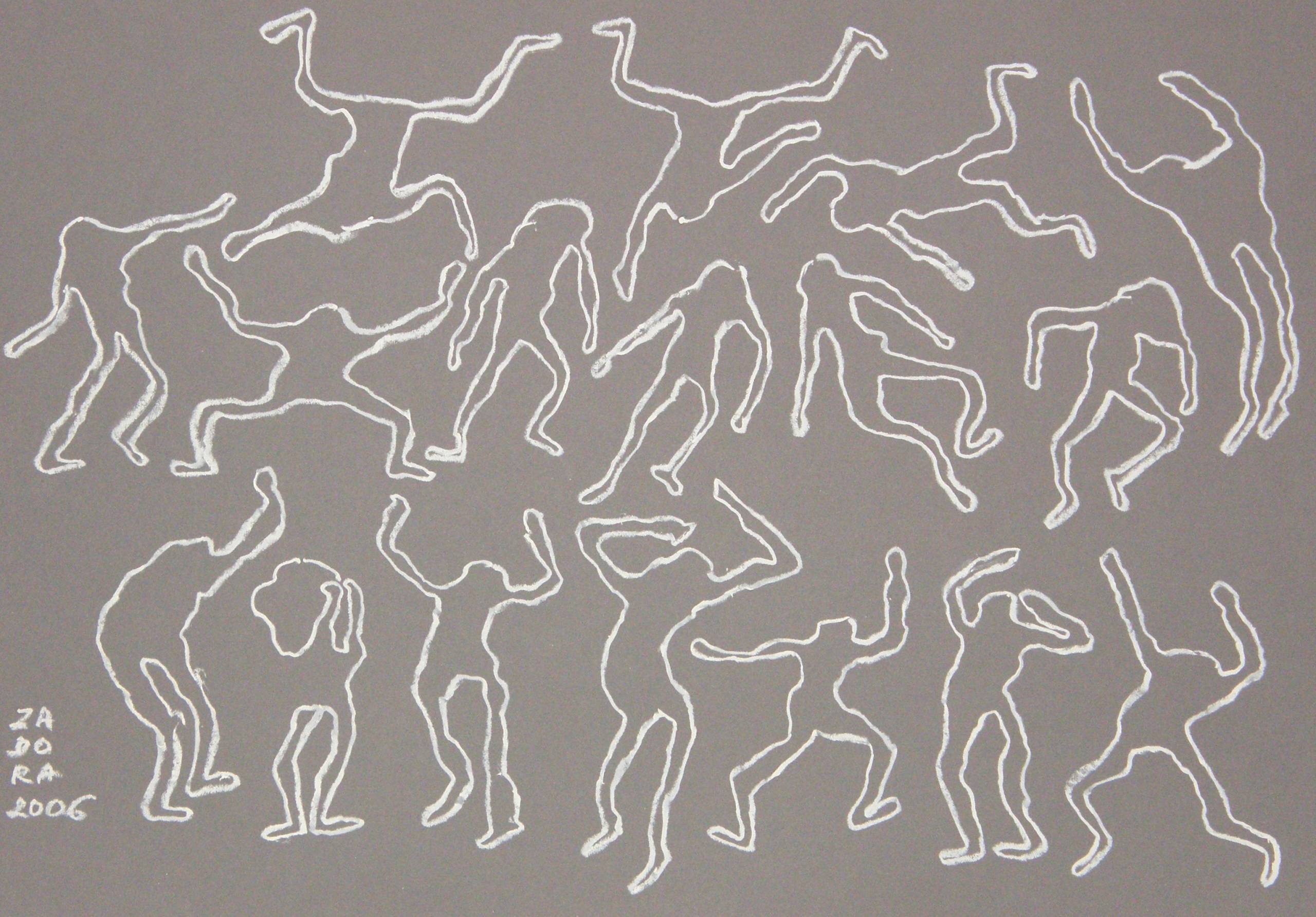 Obraz ukazuje dynamiczną kompozycję złożoną z białych konturów przypominających sylwetki ludzkie na szarym tle. Każda postać zdaje się być w ruchu, tańczyć, wyginać się w różne strony. Linie są proste, niemal dziecięce, co dodaje całości swobodnego, trochę niechlujnego uroku. Przywodzi to na myśl spontaniczny "freestyle" taneczny, który wywołuje uśmiech na twarzy. Atmosfera obrazu jest radosna, pełna życia i energii, ale też ukrytej harmonii. Styl artystyczny opiera się na minimalizmie; artysta używa prostych linii, by wyrazić złożone emocje. Technika rysunkowa nadaje dziełu lekkości, a jednocześnie mocnej ekspresji. Patrząc na to, mamy wrażenie, że jest to pochwała życia, ruchu i wolności. Jakby chciało powiedzieć "boogie all night long". Każda sylwetka zdaje się radośnie świętować swoją indywidualność. Obraz może wywoływać różnorodne emocje. Może być odbierany jako symbol jedności w różnorodności, że jesteśmy różni, ale razem tworzymy coś pięknego. Z jednej strony to dzieło można interpretować jako chaotyczne, ale z drugiej, jako odzwierciedlenie perfekcyjnego chaosu życia. "Wyglądają jak tańczący ludzie!" napisałby mały człowieczek, dostrzegając w tych kształtach prostą, dziecięcą radość z ruchu. Obraz przypomina mi chwile, gdy wszyscy jesteśmy jednym ruchem i jednym rytmem. Jest w nim coś hipnotyzującego, co sprawia, że dopatrujemy się w nim ukrytych znaczeń. W gruncie rzeczy, jest to przypomnienie, że sztuka nie musi być skomplikowana, by być głęboka.