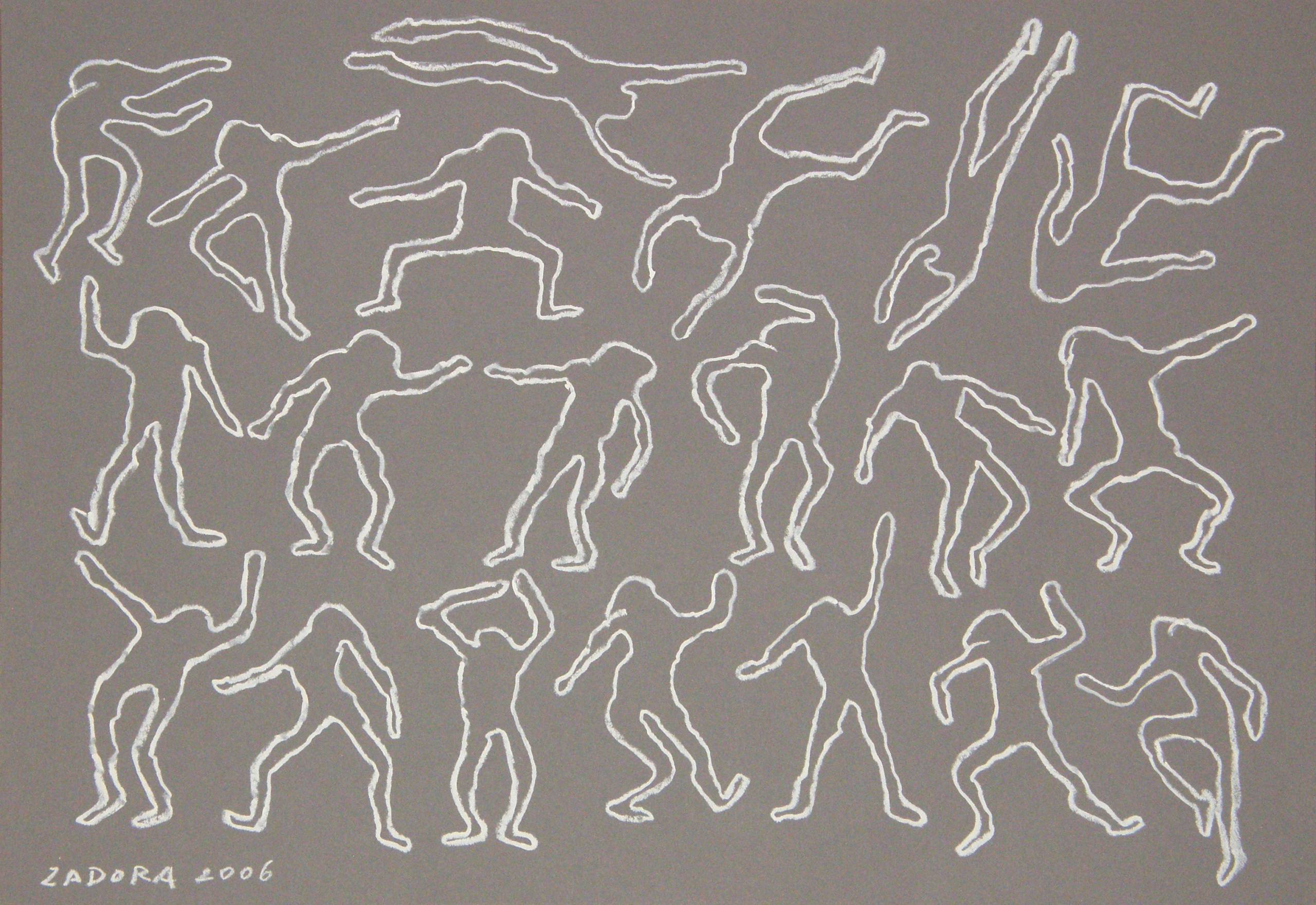 Na obrazie dominują białe sylwetki ludzkie na szarym tle. Kontury postaci są proste, wręcz schematyczne, ale pełne dynamizmu i energii. Rozmieszczone chaotycznie na płótnie, każda figura wydaje się być w ruchu. Cała kompozycja przypomina wirujący taniec, gdzie każdy gest i ruch tworzą harmonijną całość. Przywodzi to na myśl rytm i zsynchronizowane ruchy, jak w jakimś mistycznym dance party. Atmosfera? Jest jednocześnie pełna życia i niezwykle hipnotyzująca. Styl tego dzieła jest minimalistyczny, artysta wykorzystał proste linie i ograniczoną paletę kolorów, co dodaje mu uniwersalności. Techniką przypomina odręczne szkice, co dodaje mu casual touch. Można powiedzieć, że obraz tętni radością i wolnością, jednocześnie pozostawiając dużo miejsca dla wyobraźni. Patrząc na te sylwetki, można poczuć jakby się było w ich środku, tańcząc bez końca. Ciekawe, że taki prosty rysunek potrafi wywołać tyle emocji. Czy to nie jest niesamowite? Patrzę na to i myślę "Wow, jak oni skaczą!" – powiedziałoby pewne dziecko. Czyż życie nie jest właśnie takim tańcem, pełnym niespodzianek i spontanicznych gestów? Ten obraz zaraża lekkością, a przyglądając się mu, odczuwam dziwną ulgę i radość. Nic, tylko patrzeć i czekać, aż samemu zacznie się tańczyć.