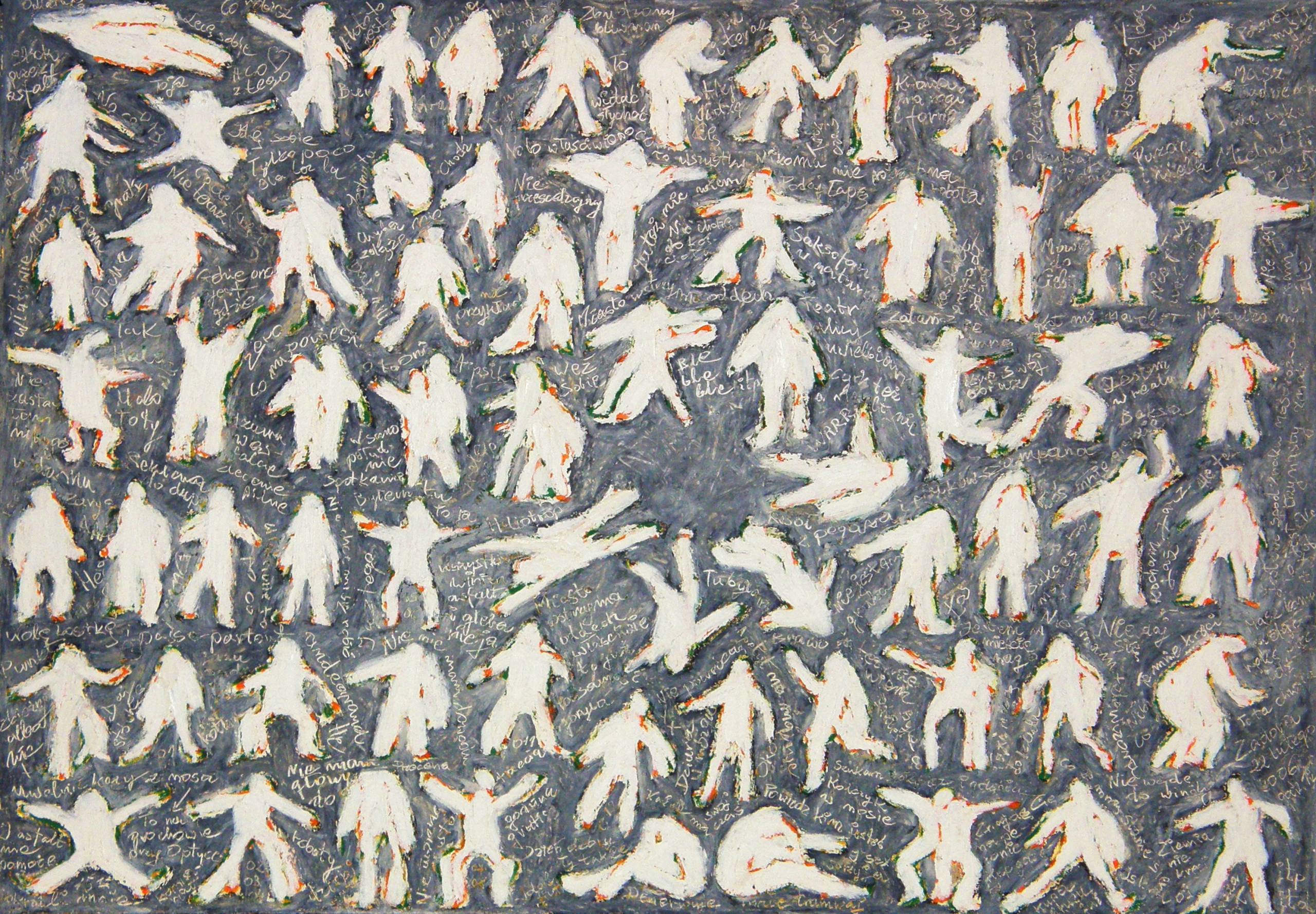 Obraz przedstawia zbiór białych sylwetek postaci, porozrzucanych na ponurym, ciemnym tle. Biała farba niemal kipi na krawędziach tych figur, tworząc kontrast z szarością tła. To wszystko sprawia, że postacie wydają się ożywać, jakby chciały wyjść z płótna. Całe dzieło pokryte jest ledwo czytelnymi, chaotycznymi napisami, które wzbudzają niepokój i tajemniczość. Czy to myśli, czy fragmenty rozmów? Nie wiadomo. Wywołuje to napięcie, jakby artysta chciał podkreślić nieustanny ruch – life's chaos. Styl obrazu balansuje między abstrakcją a ekspresjonizmem, z wyraźnym naciskiem na emocje i dynamikę. Technika użycia grubych pociągnięć pędzla, niemalże impastowych, nadaje mu surowości. Ten chaos wizualny przywołuje uczucie zagubienia, ale też dziwnej fascynacji. Jakie emocje mogą się tu pojawić? Zaduma nad codziennością, może nawet smutek, ale i zrozumienie. Ale mamo, dlaczego te postacie nic nie robią? Widz może poczuć pewnien niepokój, zastanawiając się, co kryje się za tymi białymi sylwetkami.