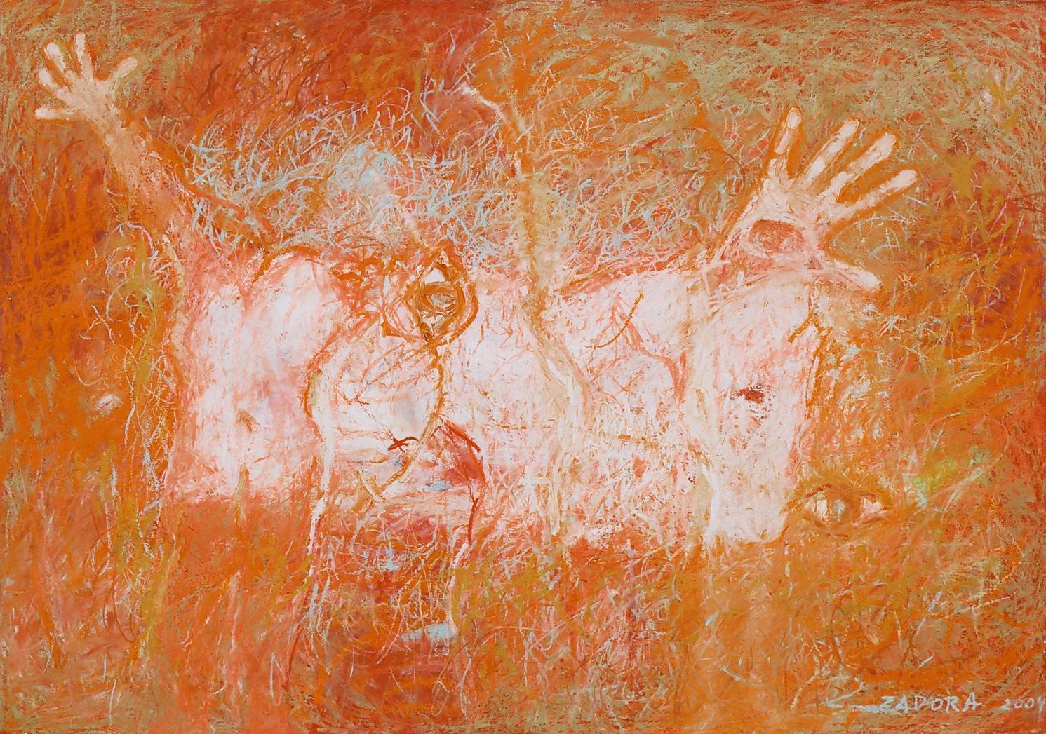 Ten obraz to prawdziwy chaos barw i form. Dominują ciepłe kolory, jak pomarańczowy i czerwony, mieszając się z jasnymi akcentami bieli i różu. Kompozycja jest silnie dynamiczna, pełna krzyżujących się i przeplatających linii, które tworzą zarys postaci z uniesionymi rękami. Całość przypomina wir emocji, niemal można poczuć wirujący taniec farby na płótnie. Artysta zastosował tu technikę impastową, co nadaje dziełu fakturę i głębokość, niemal trójwymiarowy efekt. Atmosfera obrazu jest pełna niepokoju i dynamizmu. Czujesz, jakby te postacie chciały przerwać, wyrwać się ku widzowi. Nastrój jest intensywny, wręcz elektryzujący. Look closely, dostrzeżesz niejasne kształty przypominające ludzkie twarze, ręce, może sylwetki. To może wywołać uczucie niepokoju, ale także fascynacji. Dla dziecka ten obraz mógłby wyglądać jak wielki bałagan z kolorami. Jest w nim coś pierwotnego, niemal dzikiego. A może to dżungla emocji? To sztuka nie tylko do oglądania, ale i do odczuwania. Patrząc na to dzieło, czujesz się pochłonięty przez ten wir, jakby obraz chciał opowiedzieć historię, która kryje się za jego abstrakcyjnymi formami. Coś wyjątkowego i niesamowicie intrygującego.