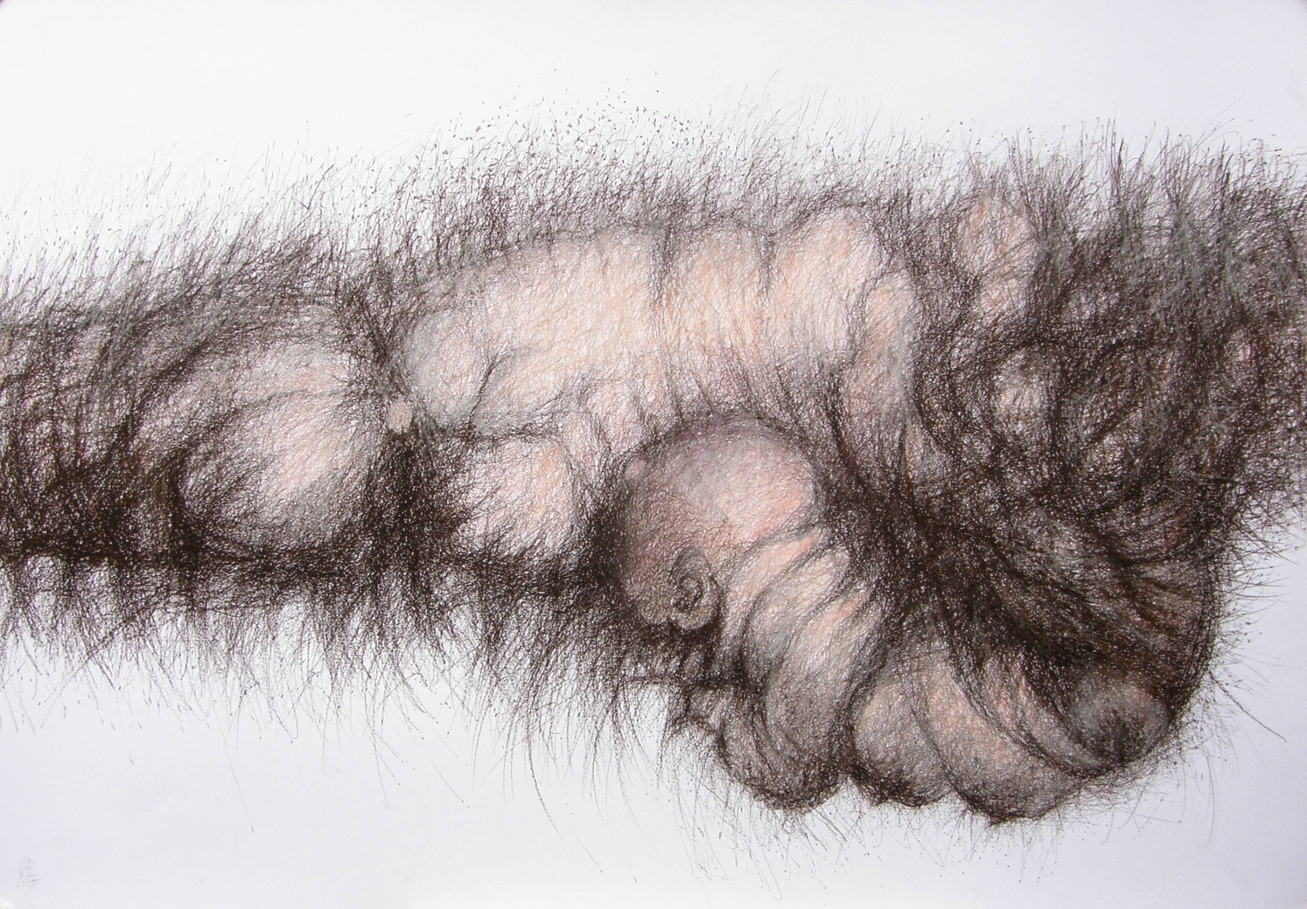 Na obrazie dominują miękkie, pastelowe barwy przeplatające się z intensywnymi, ciemnymi liniami. Kompozycja przypomina malowniczą abstrakcję, gdzie kształty są zarówno organiczne, jak i niepokojące. Spoglądając na to dzieło, można poczuć delikatny dreszcz niepewności, jakby coś znajomego kryło się pod tym chaosem. Atmosfera jest tajemnicza, jakby artysta starał się uchwycić skomplikowane sieci myśli i emocji w jednym fragmencie. Technika przypomina impresjonizm, z dbałością o detale poprzez użycie krótkich, szybkich pociągnięć ołówkiem, które budują teksturę i głębię. Patrząc na to, czujesz się jak na rollercoasterze emocji. Czy to twarz ukryta w masie linii, a może coś więcej? Może to być również refleksja nad nieuchwytnością ludzkiej natury, uchwycona w czystej formie artystycznego wyrazu. Wow, wygląda jak włochaty wieloryb! Czasami oglądając obraz, można poczuć się jak odkrywca, który pośród plątaniny linii znajduje coś new, nieoczekiwanego. To, że artysta pozostawia nas z tym poczuciem tajemnicy, sprawia, że dzieło na długo zapada w pamięć.