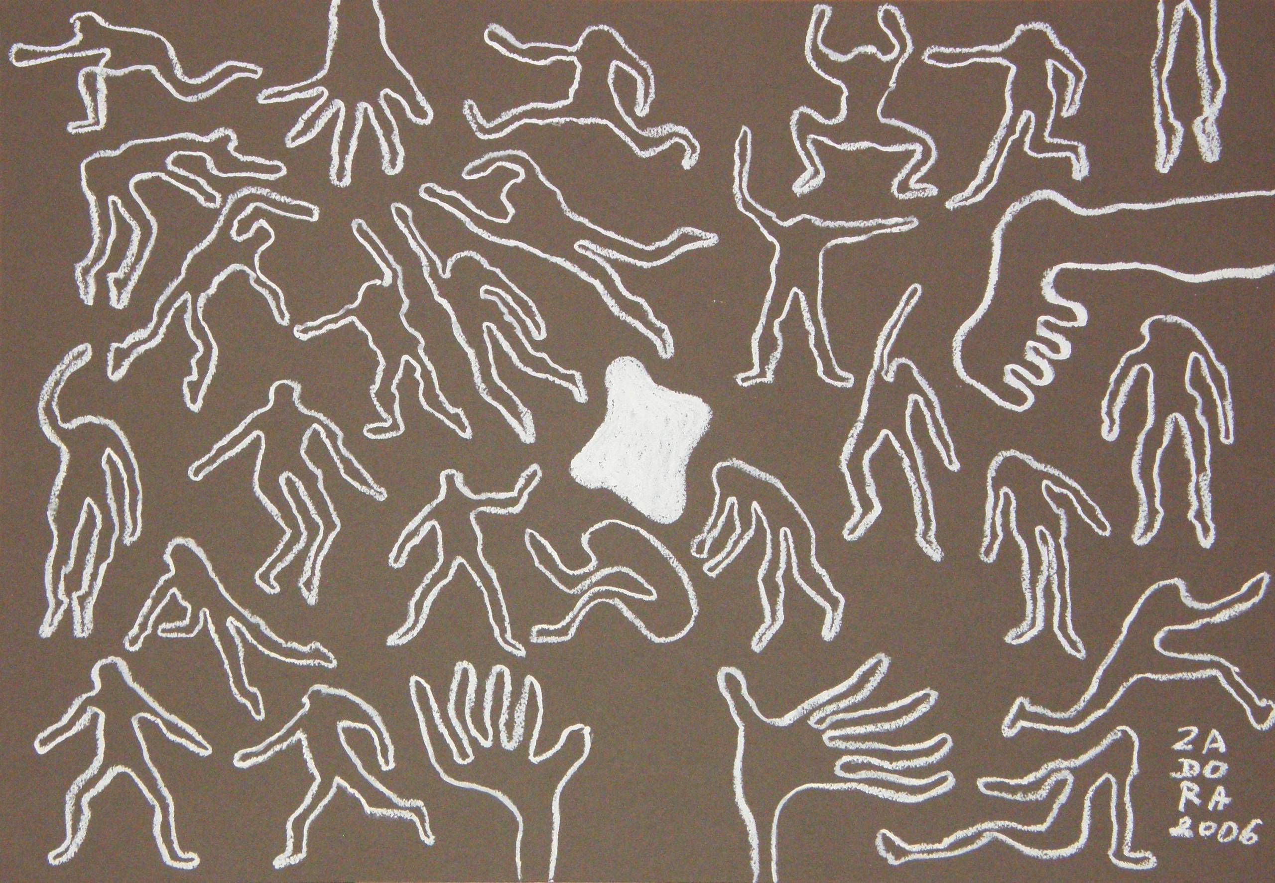 Na obrazie dominuje prostota i tajemniczość. Na tle w kolorze brązu bieli się mnóstwo schematycznych sylwetek, a każda z nich ma swój unikalny kształt, jakby artysta chciał uchwycić ruch. Postacie są jak kontury, które przypominają dziecięce rysunki. Kompozycja wydaje się chaotyczna, ale jest w niej pewien ukryty rytm. Ta sztuka jest pełna dynamizmu i energii, jak poczta o poranku. Wyglądają trochę jak duchy, ale nie są straszne, tylko ciekawe. Atmosfera dzieła jest refleksyjna, można poczuć w niej swobodę i kreatywność, trochę jak w zabawie na podwórku. Technika, jaką użył artysta, jest surowa, co dodaje naturalności. Może kreda na tablicy? Styl przypomina outsider art, z naciskiem na personalny wyraz. Obraz może wywołać u widza uczucie reminiscencji, wspomnienie dzieciństwa i beztroskich chwil. Look, it's like people are flying! To dzieło zaprasza do interpretacji, przez swoją otwartość i niedopowiedzenie. Czuję tu coś jak freedom, luz i spontaniczność. Jest w tym coś bardzo osobistego, jakby artysta chciał przekazać, że każda postać ma swoją historię.