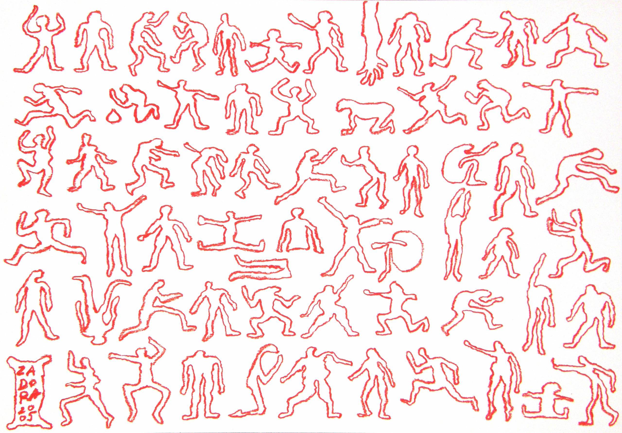 Na obrazie widzimy grupę czerwonych konturów sylwetek, które gęsto wypełniają białe tło. Kompozycja przywołuje na myśl różnorodność ruchu i dynamiki, każda postać jest jakby zamrożona w tańcu, skoku czy walce. Artysta zastosował prostotę linii, co nadaje całości coś na wzór naiwnego uroku i surowości. Dominujący czerwony kolor sprawia, że obra z jednoznacznie przyciąga uwagę. Wygląda to trochę jak z notesu dziecka, które radośnie bazgroli postacie podczas nudnej lekcji. Nastrój jest jednocześnie pełen energii jak i nieco chaotyczny, prowadząc odbiorcę przez kalejdoskop emocji i interpretacji. Każda sylwetka zdaje się mieć własną historię do opowiedzenia, ale razem tworzą jedną, tętniącą życiem kompozycję. Technika, którą posłużył się artysta, to swoiste graffiti, które w swojej prostocie przekazuje młodzieńczą rebelii. Odbiorca może odczuwać pewnego rodzaju ekscytację, a jednocześnie lekki niepokój. Patrząc na to, można się poczuć jak na koncercie, gdzie tłum buzuje od energii, a bicie serca przyspiesza. "Wow!" – mogłoby krzyknąć zachwycone dziecko, patrząc na ten zawrót głowy. Kto by pomyślał, że parę prostych kresek może tyle powiedzieć? Wartość obrazu tkwi w jego umiejętności poruszania wyobraźni. Cóż, no może to trochę crazy, ale na pewno wciągające.