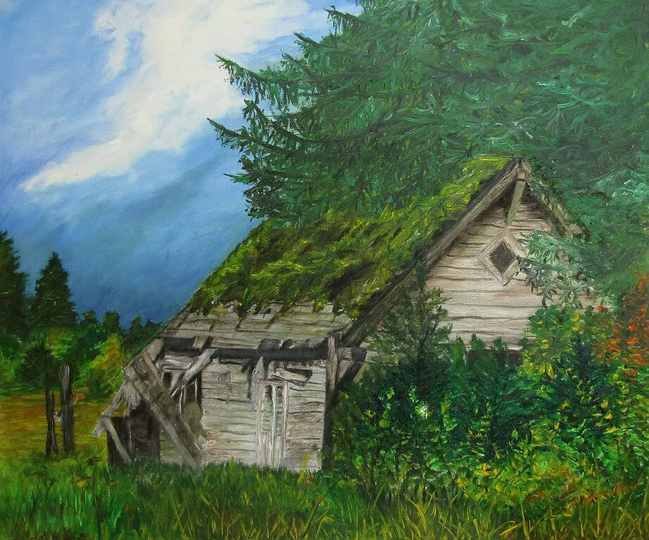 Na obrazie widzimy starą, zniszczoną chatkę ukrytą w gąszczu zieleni, która niemalże pożera jej dach i ściany. Dominują tu odcienie zieleni - od soczystej trawy po ciemne, tajemnicze igły drzew. Kompozycja jest spokojna, leniwa wręcz, jak letni dzień, gdy czas zdaje się płynąć wolniej. Niebo, choć pogrążone w chmurach, jest niebieskie i obiecujące. Jakby ktoś wziął pędzel i jednym pociągnięciem namalował błogi krajobraz. Atmosfera obrazu jest nostalgiczna, wywołująca tęsknotę za utraconym, za przeszłością, która schowała się pod warstwą mchu. Artysta użył olejnych farb, co dodaje tekstury i głębi. Uczucie wyściełania przestrzeni kolorami sprawia, że prawie można poczuć zapach trawy i usłyszeć szum liści. To rustykalna kompozycja, która wciąga widza swoją prostotą i autentycznością. Człowiek patrzy na ten obraz i myśli "co za cudowny spokój", a chwilę później przychodzi refleksja nad ulotnością rzeczy. Dla dziecka to miejsce może być magicznym zakątkiem pełnym tajemnic. Obraz emanuje ciepłem, ale w tym cieple jest również coś secretive, jakby skrywał tajemnice minionych dni i dawnych opowieści.