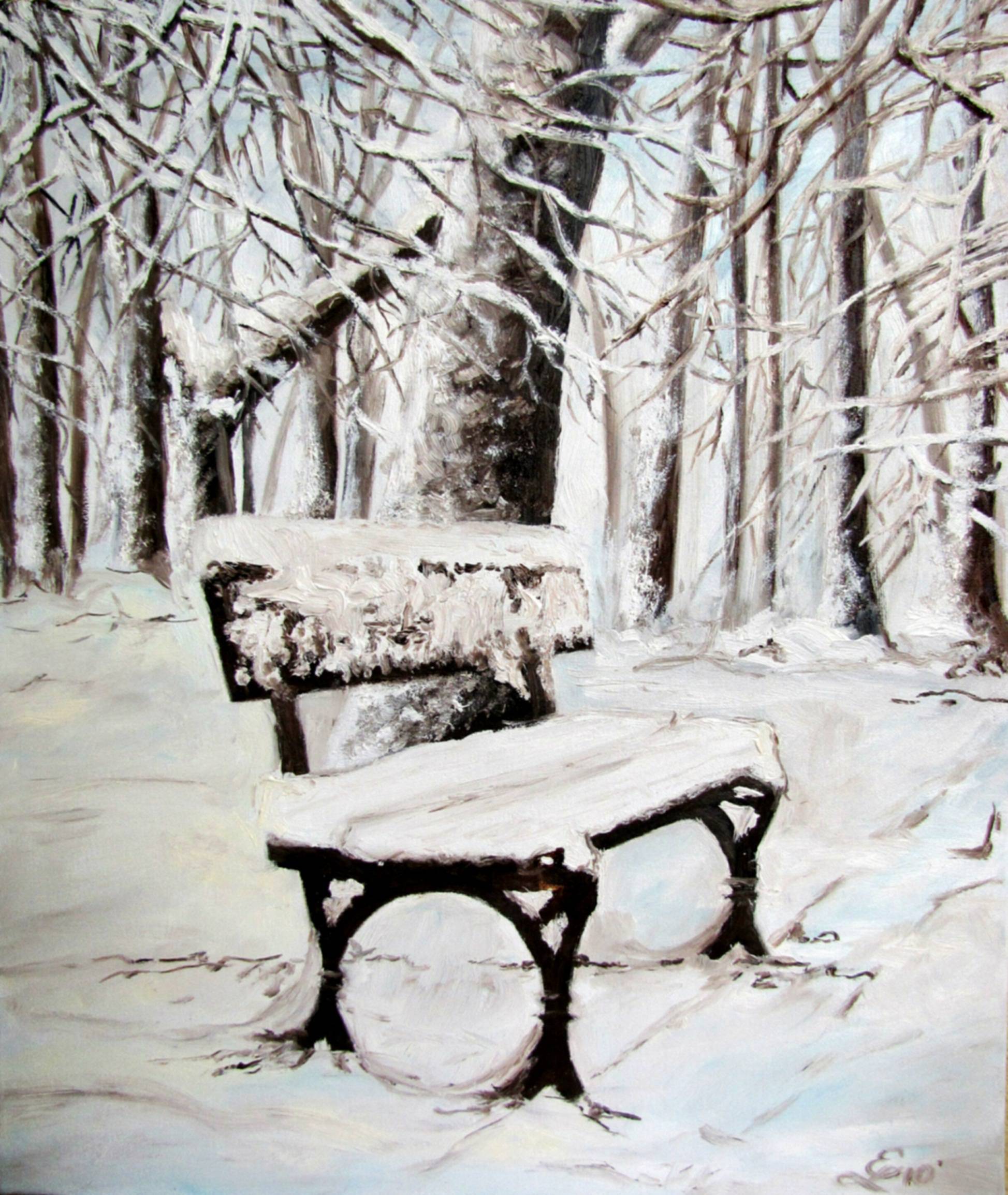 Na obrazie widać samotną ławkę w pokrytym śniegiem lesie. Przez dominujące biele i szarości emanuje chłód oraz spokój zimowego krajobrazu. Grube pnie drzew są oplecione gałęziami przypominającymi pajęcze sieci, które zdobią każda śnieżynka. Kompozycja jest prosta, ale uderza swoją ciszą i nostalgią. Czuć, jakby czas się zatrzymał, a chwila trwała wiecznie. Artysta używa miękkich pociągnięć pędzla, które oddają delikatność śniegu. Impasto! Faktura tego wynosi obraz na wyższy poziom, dodaje mu prawdziwości. Patrząc na ten widok, można poczuć ulgę, jak gdyby zmartwienia były nagle daleko. Śnieg? On przecież zawsze ma w sobie coś magicznego, a dzieciak powiedziałby: "Wow, jaka duża zima!" Obraz budzi uczucie samotności, a zarazem skłania do refleksji nad prostotą życia. Spacer w takiej scenerii byłby jak chwila medytacji. Lubię to. Budzi się we mnie dziecięca radość z pierwszego śniegu. Jest w tym coś surowego, ale i ujmującego. Ciekawy akcent stanowi kontrast ciemnego drewna ławki na tle bieli. Ta zimowa symfonia barw przypomina o pięknie natury ukrytym w chłodnym uścisku zimy.