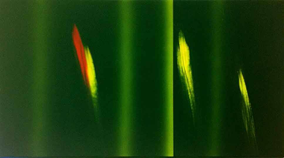 Na obrazie dominuje ciemnozielona paleta z delikatnymi, pionowymi smugami, które przypominają cienie przenikające przez zasłonę. Centralnym punktem jest jeden wyrazisty akcent - intensywny, czerwony kształt otoczony żółtym odcieniem, wyłaniający się z ciemności. Tego typu kompozycja przyciąga uwagę widza, tworząc kontrast między spokojem zieleni a dynamicznością czerwieni. Atmosfera dzieła jest nieco tajemnicza, jakbyśmy spoglądali przez mgłę na tańczące w niej światła. Można odczuć nutę niepokoju pomieszaną z chwilową eksplozją energii. Styl artystyczny wydaje się abstrakcyjny, z subtelnie zaznaczonymi pociągnięciami pędzla, które dodają tekstury i głębi. Malarska technika sugeruje lekkość i płynność, które sprawiają, że obraz żyje na naszych oczach. Czy patrząc na ten obraz można poczuć się jak w kosmosie? Takie uczucia mogą się pojawić. Dzieciak mógłby powiedzieć: wygląda jak kosmiczna rakieta! To dzieło prowokuje do refleksji nad naturą światła i cienia, inspirując do poszukiwań odpowiedzi na to, co niewidzialne. Widz może zastanowić się, co symbolizuje czerwony kształt, czy jest to "free" duch, próbujący wyrwać się na wolność? Obraz przyciąga, hipnotyzuje, a jednocześnie nie pozwala oderwać wzroku.