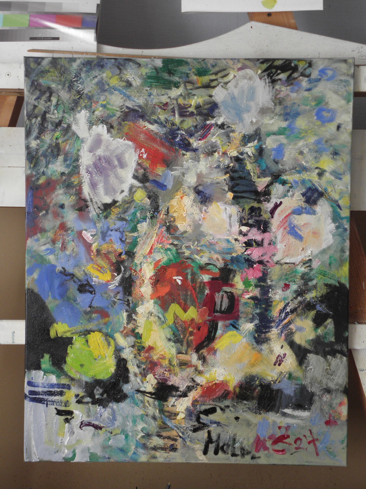 Ten obraz to istny feeria barw. Widzimy na nim zlepek kolorów i kształtów, które zdają się wirującą rzeczywistością. Dominują odcienie niebieskiego, czerwonego i zielonego, przeplatane z jaśniejszymi plamami bieli i różu. Kompozycja jest pełna ekspresji, jakby artysta zamierzał pokazać chaos stworzony w chwili emocjonalnego uniesienia. Atmosfera tego dzieła jest dynamiczna i zmienna, niemal jakby obraz próbował opowiedzieć własną historię. Nastrój przypomina mi trochę jesienny wiatr, taki co potarga włosy i skłoni do refleksji. Artysta wykorzystał technikę impastu, nakładając grubą warstwę farby, co nadaje teksturę i głębokość. Styl jest typowy dla ekspresjonizmu abstrakcyjnego – bez wyraźnych form, skupiony na emocjach i intuicji. Obraz może wywołać różne emocje, od poczucia tajemnicy po spontaniczną radość. Może nawet trochę niepokoju, bo co to wszystko znaczy? My mind is blown! Dziecko mogłoby powiedzieć: „To wygląda jak wielka kolorowa plamka, jakby ktoś rozlał tęczę.” To mieszanka formalności z beztroską, gdzie każde spojrzenie wywołuje nową refleksję. Dzieło fascynuje swoją nieprzewidywalnością.