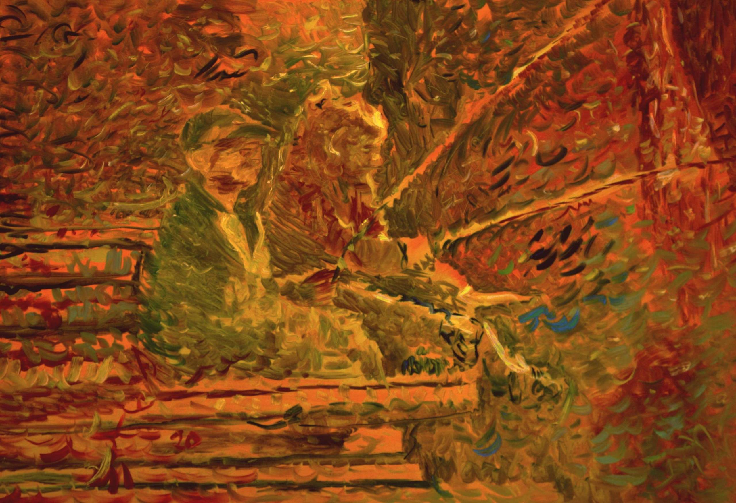 Obraz emanuje ciepłem jesieni, z przewagą czerwieni i pomarańczy, które dominują na płótnie. Wyraźne pociągnięcia pędzla tworzą dynamiczną kompozycję pełną energii. W centrum widać postacie na ławce, otoczone przez miriady liści. Ten ruch i powiew unoszą się niemal jak żywioł, tworząc aurę nostalgii. Artysta zastosował technikę impasto - grube warstwy farby dodają głębi, co sprawia, że obraz jest jakby przytulny. Jest tu coś magicznego, co wywołuje u odbiorcy mieszankę spokoju i refleksji. Nastrój jest melancholijny, ale z domieszką ciepła, jak zimowe słońce w pochmurny dzień - trochę happy, a trochę sad. Malarska technika dodaje dramatyzmu, lecz jednocześnie uspokaja. Można by powiedzieć, że patrząc na obraz, chce się usiąść gdzieś w jego ciepłym zakątku i po prostu być. Dziecięce oczy mogłyby zawołać: „To jak zaczarowany ogród!” Czuje się, jakby ten zakątek świata miał swoją historię. Obraz robi wrażenie niedokończonej opowieści, w której każdy fragment za pomocą potężnych barw opowiada własne tajemnice. Bardzo wyrazisty, a jednak sprawia wrażenie, jakby zapraszał do snucia własnych marzeń.