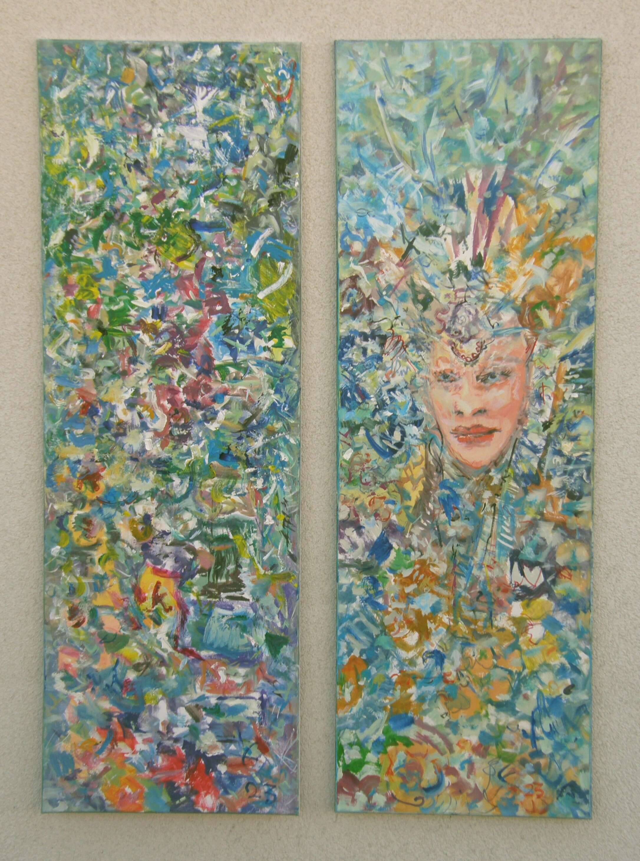 Na obrazie widzimy wybuch kolorów, które razem tworzą coś na kształt symfonii barw. Zielone, niebieskie i żółte plamy dominują na dwóch panelach, nadając całości kalejdoskopowy efekt. Kompozycja jest dynamiczna i pełna ruchu, jakby artysta chciał uchwycić esencję natury w jej najbardziej chaotycznej formie. To trochę jak rzeka, która nie zna granic. Nastrój obrazu jest raczej magiczny, niemal jak sen, gdzie rzeczywistość łączy się z fantazją. Artysta zastosował technikę impastu, co widać po grubych warstwach farby, które tworzą trójwymiarową teksturę. Wyłaniająca się po prawej postać przypomina ducha lasu, dodając tajemniczości. Obraz może wzbudzać uczucie zagubienia, ale też fascynacji. Każdy detal prowokuje do zatrzymania się na chwilę. Czujesz, jakbyś oglądał baśń bez początku i końca. "Wow, to wygląda jak las dla wróżek!" mogłoby powiedzieć dziecko. Z jednej strony chaotyczny, z drugiej – harmonijny w abstrakcji. Dziwne uczucie, prawda? A może to tylko "wilderness" życia przeniesione na płótno. Czuć, jak artysta bawi się formą, nie bojąc się eksperymentów. Mamy tu coś, co przyciąga, nie pozwala odejść obojętnie.