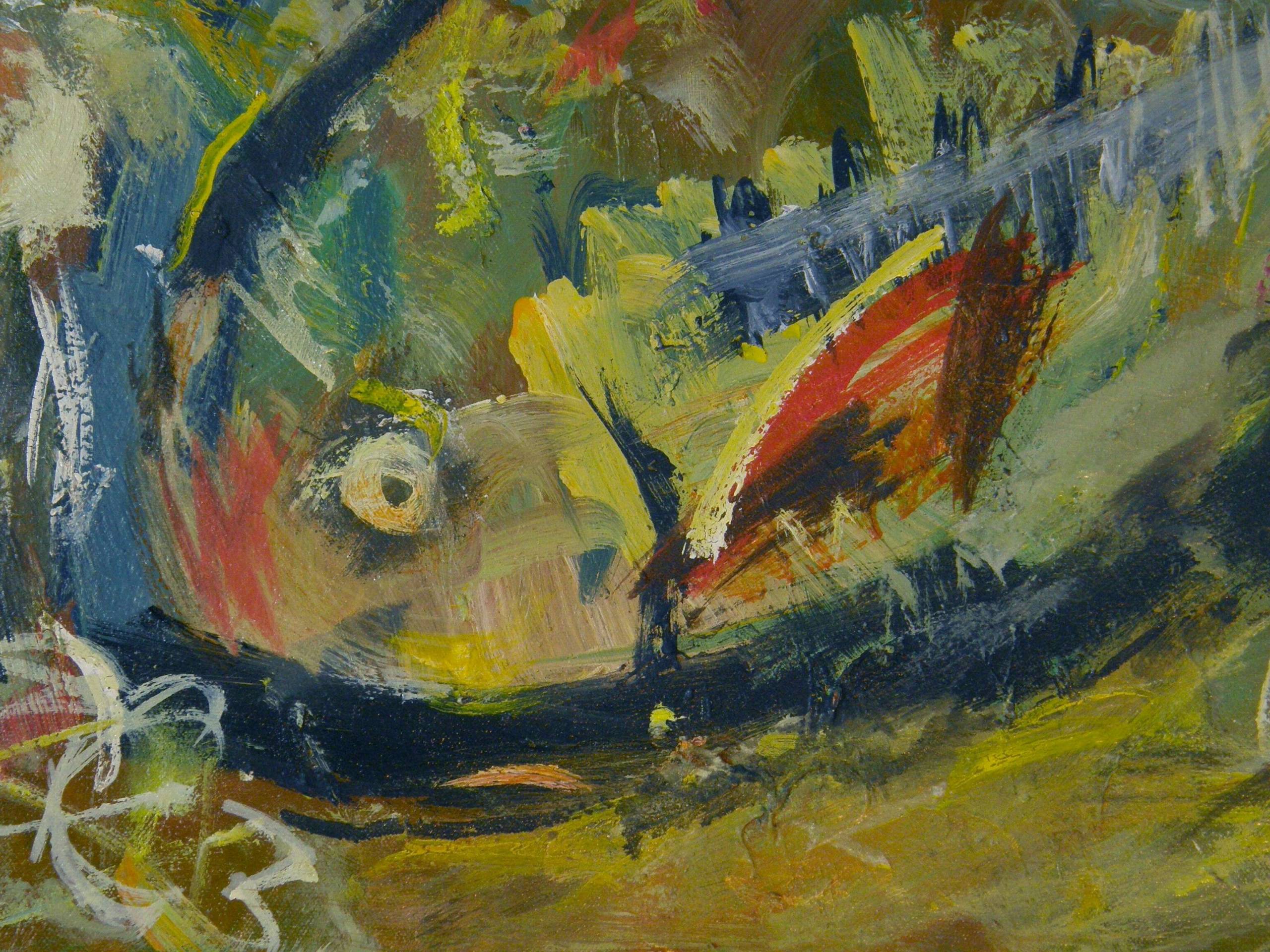 Na obrazie dominują szalone kolory, które splatają się w zawrotnym tańcu. Od razu rzucają się w oczy intensywne błękity, zielenie i ciepłe odcienie ziemi. Kształty są dynamiczne i abstrakcyjne, przyciągają wzrok swoją nieoczywistą formą. Kompozycja wydaje się być chaotyczna, a mimo to w tym chaosie kryje się porządek. Atmosfera dzieła jest jak burza emocji, coś na pograniczu szaleństwa i spokoju. Wow, ale to wygląda jak kolorowy bałagan! Styl artystyczny jest z pewnością ekspresjonistyczny. Artysta zastosował techniki nakładania grubych warstw farby, które nadają obrazowi fakturę i głębię. Emocje wylewają się z obrazu, niemal dotykając widza. Można poczuć ten prąd, który porywa myśli. Obraz może wywoływać różnorakie emocje. Od zachwytu przez niepokój, aż po skłaniającą do refleksji zadumę. A maybe jest tu coś z marzenia sennego. Patrząc na tę plątaninę kolorów, można się poczuć jak dziecko błądzące po tajemniczym lesie. Ciekawe, co by to powiedziała moja wyobraźnia, gdybym miał 7 lat? Pewnie bym chciał jescze raz zobaczyć, co tam się kryje.