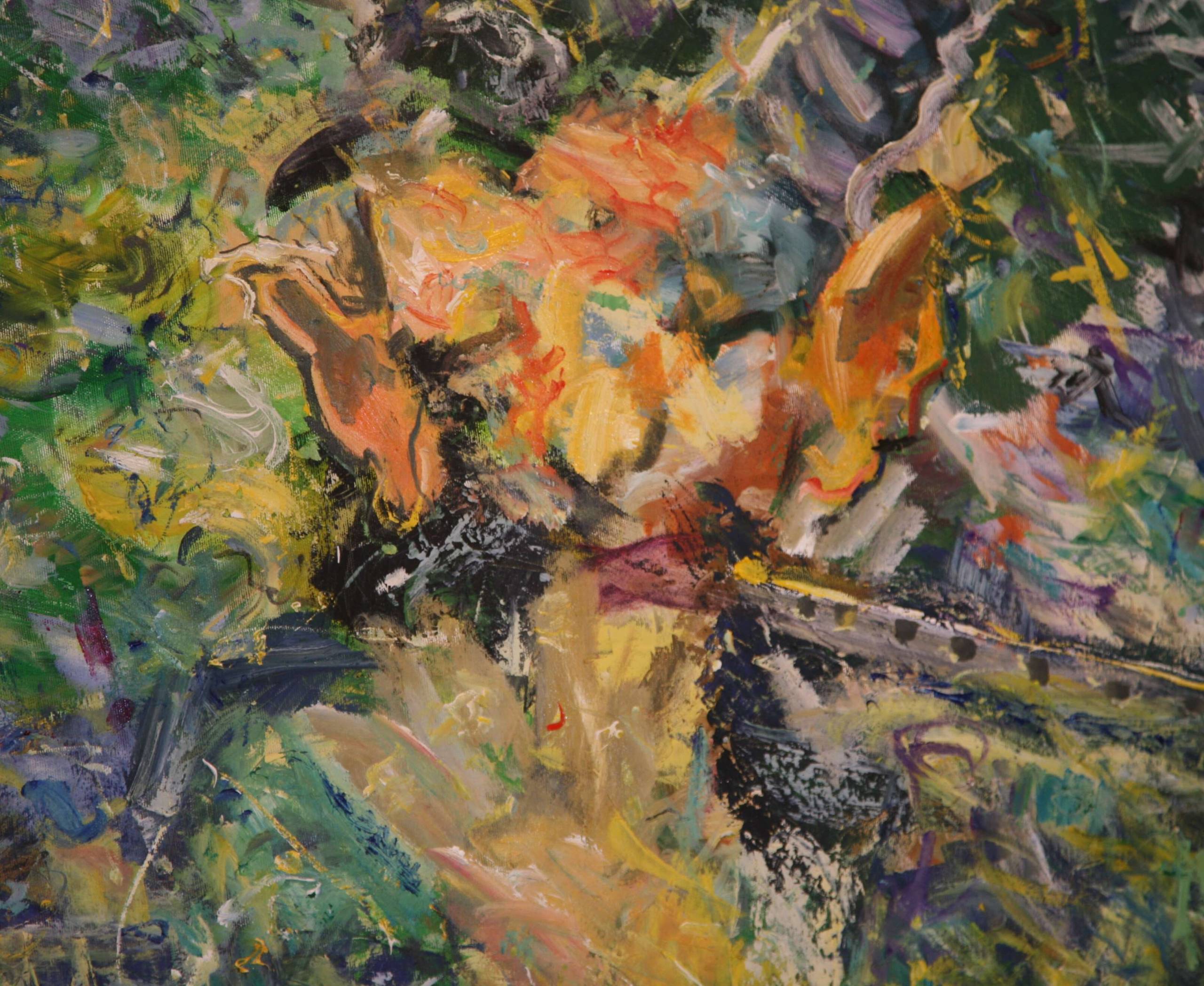 Obraz emanuje prawdziwą feerią kolorów, które niczym konfetti rozrzucone są po płótnie. Przewaga zieleni i żółci miesza się z pomarańczowymi akcentami, tworząc dynamiczną, wręcz chaotyczną kompozycję. Kształty są rozmyte, a technika impastu nadaje całości tekstury. Czy można tu zobaczyć jakieś postacie? Może to tylko złudzenie, ale wydaje się, że w tle kryją się sylwetki. Atmosfera jest żywa i energiczna, przypomina gorący letni dzień pełen pasaży dźwięków i świateł. Styl artystyczny, nieco impresjonistyczny, delikatnie ukrywa szczegóły, co dodaje obrazu tajemniczości. Artysta zdaje się mieszać formalne podejście z intuicyjnym błyskiem. Jest w tym obrazie coś, co sprawia, że serce zaczyna bić szybciej. Może to ten kolorowy chaos oddaje burzę emocji? Kiedy się spogląda, można zanurzyć się w kalejdoskopie uczuć, od radości aż po zamyślenie. To jak oglądanie "confetti of emotions" w formie obrazkowej. Dla mnie to dzieło przypomina radosne wspomnienia z dzieciństwa, gdy wszystko wydawało się możliwe. Taki obraz może zabrać człowieka gdzieś daleko, jak ciepły podmuch wiatru w letnie popołudnie. Czuję, że każdy mógłby znaleźć tu coś dla siebie, coś co poruszy jego serce. To piękne w sztuce, że jest tak subiektywna i pełna niespodzianek.