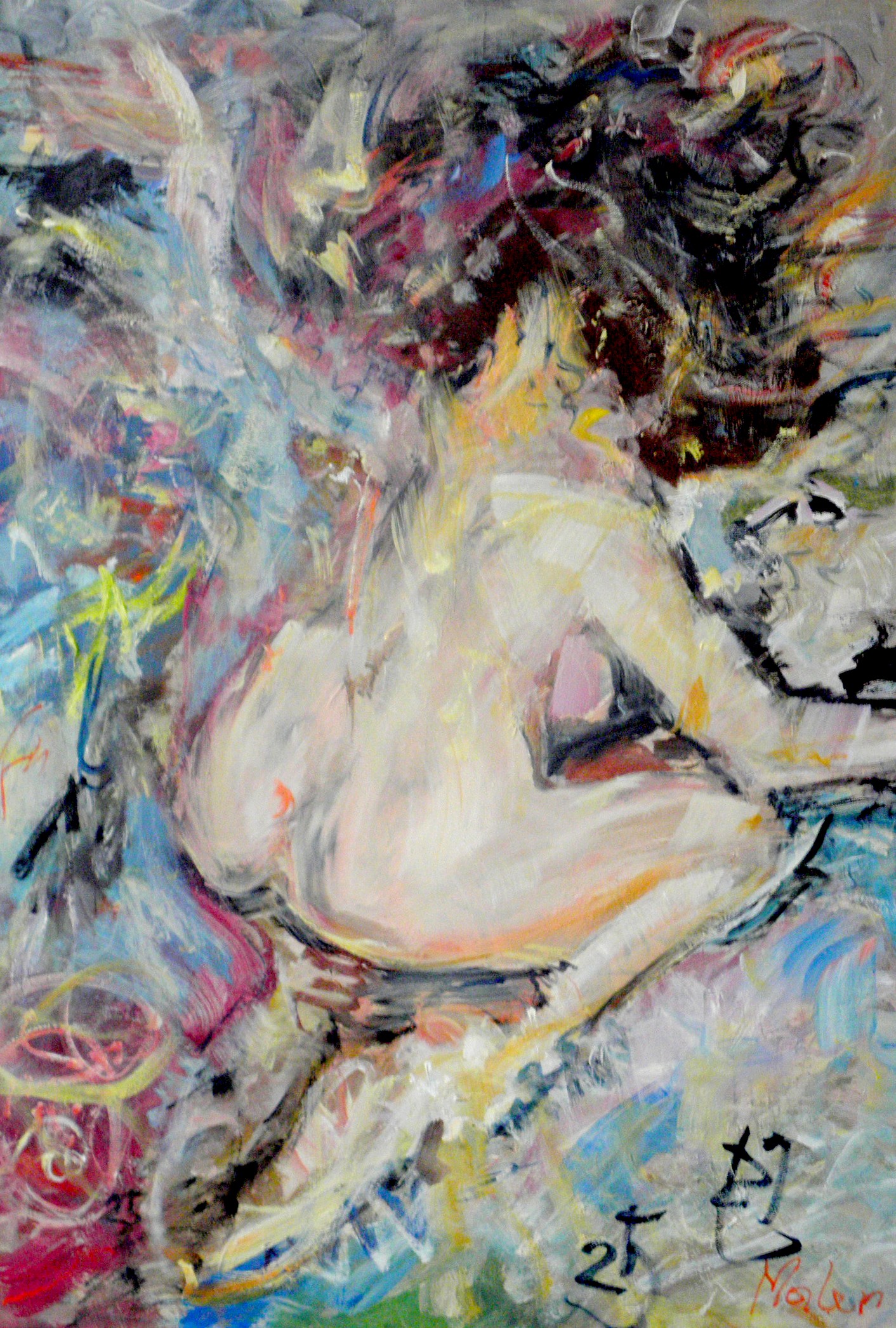 Na płótnie wiruje postać kobiety. Nagie plecy i biodra są jasne, mleczne, jakby wyciągniete z mgły, a dookoła kipią szarości, brudne błękity, róże i nagłe smugi żółci. Kompozycja jest skośna i niespokojna, ciało skręca się w półobrocie, a głowa ginie w ciemnym kłębowisku pociągnięć pędzla. To wygląda jak ekspresyjny olej albo akryl, grubo kładziony, miejscami rozcierany, z gestem prawie agresywnym. Nastrój. Duszny, intymny, trochę jak sen po ciężkim dniu. Ja czuje tu wstyd i wolność naraz, takie dziwne drżenie w brzuchu. Kolory szepczą i krzyczą jednocześnie, very raw. Mały człowiek by powiedział. Ta pani jest biała i kręci sie jak wiatr. Można to czytać jako walkę z własnym obrazem, albo chwilę ulgi, kiedy nikt nie patrzy, choć jakby jednak patrzył.