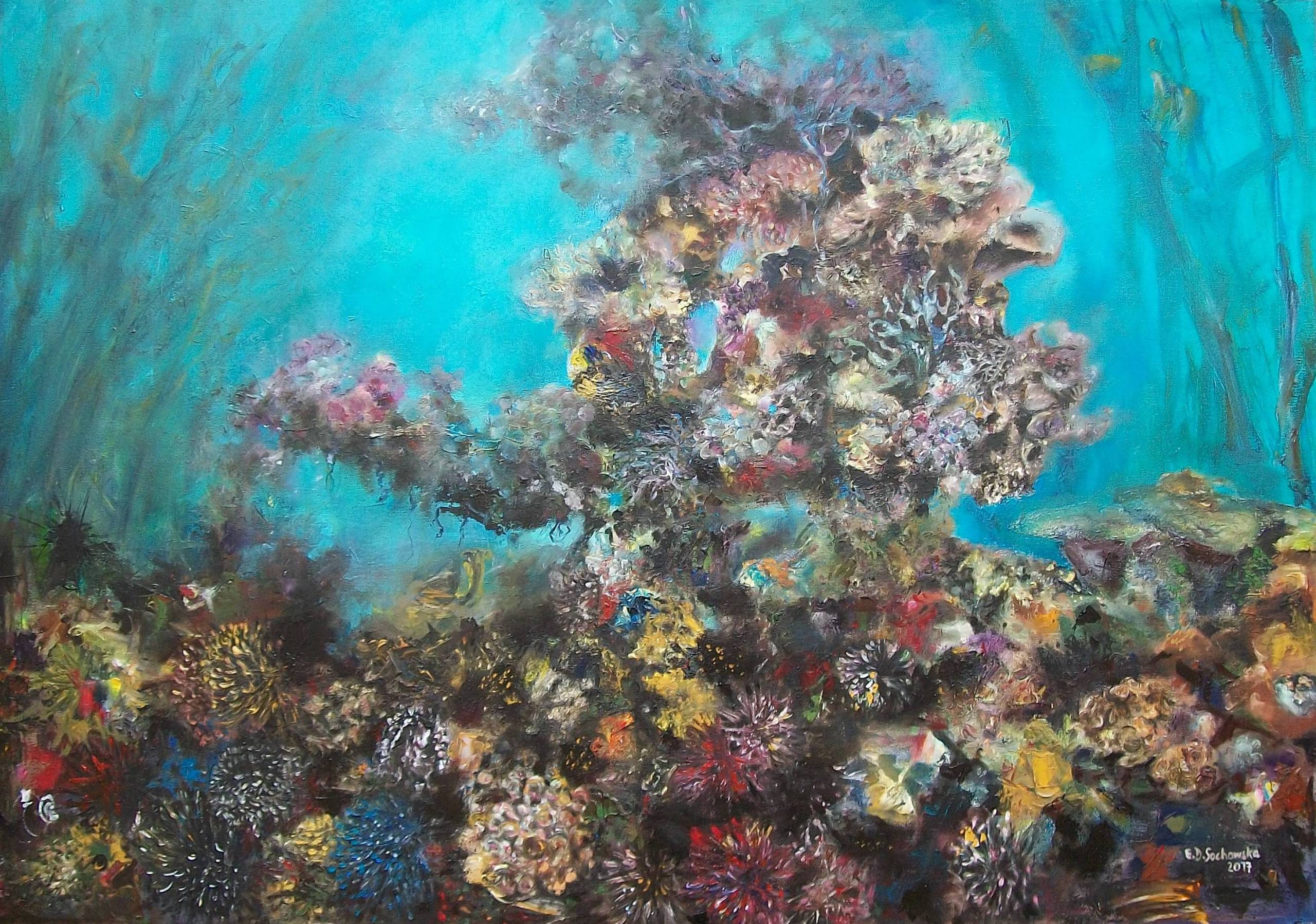 Obraz przedstawia podwodne królestwo pełne bajecznych kolorów i kształtów. Dominują intensywne odcienie błękitu, które tworzą spokojne tło dla pełnej życia rafy koralowej. Koralowce eksplodują paletą barw, od żółci, przez czerwienie, po subtelne fiolety, tworzące zjawiskowy kalejdoskop. Ich organiczne formy są niemalże nieziemskie, co przyciąga wzrok i inspiruje wyobraźnię. Można prawie poczuć chłodną bryzę oceanu. Atmosfera obrazu emanuje spokojem, ale i dynamicznym życiem, jakby czas płynął inaczej pod wodą. Artysta użył technik impresjonistycznych, z delikatnymi pociągnięciami pędzla, co dodaje dziełu lekkości i płynności. Akwarele i oleje pięknie się przenikają, tworząc paradise under the sea. Obraz może wywoływać różnorodne emocje – od zadumy po dziecięcą radość odkrywania. "Tam mieszkają rybki!" może powiedzieć zachwycone dziecko. Mnie osobiście obraz skłania do refleksji nad pięknem natury i potrzebą jej ochrony. W swym tajemniczym, ale przyjaznym tonie, obraz zaprasza do zanurzenia się w jego nieskończonych głębiach.