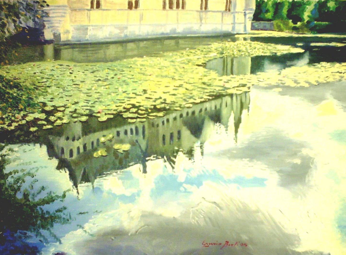 Na obrazie widzimy urokliwy widok zamku odbijającego się w spokojnej tafli wody. Dominują delikatne zielenie i błękity, które współgrają z pastelowymi odcieniami murów budowli. Kształty są miękkie, a kompozycja harmonijna, tworząc wrażenie spokoju i harmonii. Obraz emanuje nostalgiczną atmosferą letniego popołudnia, jakby czas stanął w miejscu na chwilę refleksji. Artysta wykorzystał technikę impresjonistyczną, z delikatnymi, niemalże pociągnięciami, capture the fleeting moments. Jakież to urocze! Obraz może wywoływać uczucie ukojenia, ale też lekki smutek za czymś utraconym. Patrząc na wodne lilie unoszące się na powierzchni, można niemalże poczuć lekką bryzę i letnie promienie słońca na skórze. "Zamek jest jak zaczarowany dom na wodzie", powiedziałby 7-latek, zauważając magiczny aspekt tej scenerii. Każdy detal zdaje się szeptać opowieści o dawnych czasach, a delikatna gra światła zabiera odbiorcę w inny świat pełen marzeń.