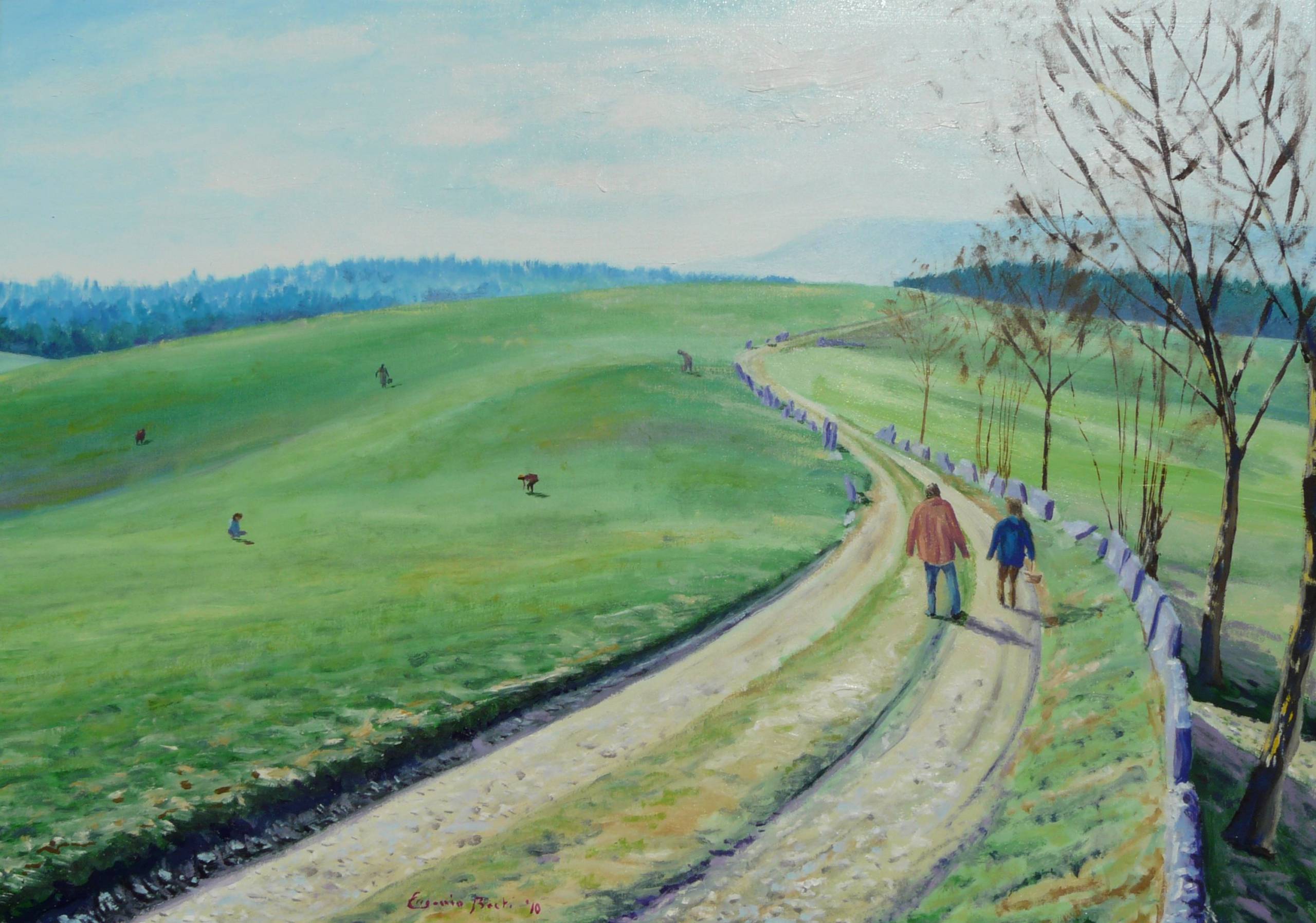 Obraz przedstawia sielankowy krajobraz, w którym dominuje soczysta zieleń porośniętych trawą wzgórz. Droga wijąca się przez pole tworzy delikatny łuk, prowadząc wzrok ku horyzontowi. Na pierwszym planie widzimy dwie postacie przechadzające się spokojnie, być może tylko z koszem pełnym piknikowych smakołyków. Ścieżka, choć ubita, zdaje się zapraszać do spaceru. Niebo jest lazurowe, rozświetlone słońcem, zawieszonym gdzieś poza kadrem. Atmosfera obrazu jest pełna spokoju, jak letnie popołudnie, które rozleniwia. Kolory są stonowane, lecz jednocześnie żywe. Trawa w kierunku widza przechodzi w bardziej intensywną zieleń przy drzewach. W oddali widać pasmo lasu, które delikatnie wieńczy pejzaż. To idealne miejsce na podziwianie natury. Artysta zastosował technikę, która przypomina akwarele, choć to olej na płótnie. Pociągnięcia pędzla są płynne, a detale subtelne. Czuć tu ducha impresjonizmu, chociaż niektóre elementy są znacznie bardziej realistyczne i szczegółowe. Obraz wywołuje refleksje o prostocie i pięknie codzienności. Może przypominać dzieciństwo na wsi, czas beztroski i odkrywania. A więc pewien rodzaj "freedom", jaki daje otwarta przestrzeń. Obraz mówi o wolności wyboru i niezależności myśli. "A czy my też tam pójdziemy?" mogłoby zapytać dziecko, widząc tę spokojną scenę. Ta praca jest niczym otwarta książka, zachęca do własnych interpretacji i marzeń.