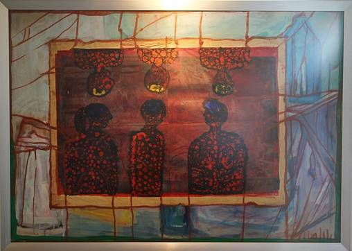 Unikatowy obraz z lat 80tych, odnaleziony w archiwum artysty i na nowo oprawiony. Eugeniusz Molski tworząc, wykorzystuje wszystko co ma pod ręką. W jego dziełach wszystko jest przemieszane jak w życiu. One bowiem powstają na gorąco, pod wrażeniem chwili, w wyniku fascynacji, przeżycia. Są to swoiste opowieści zarówno o życiu jak i tworzeniu, a także o artystycznych marzeniach twórcy o idealnym świecie. Artysta lubi tworzyć serie będących jego opowieścią plastyczną o konkretnej sprawie lub historiach. Bujność wyobraźni twórcy jak również aktywność powodują, że twórczość ta jest niezwykle bogata. Obraz oprawiony w ramę aluminiową Montax, New York