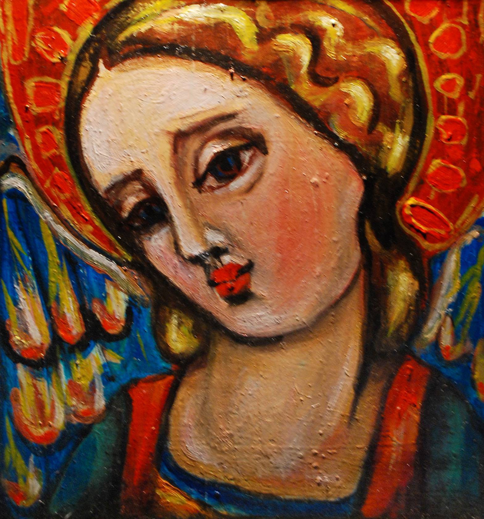 Obraz emanuje intensywnymi barwami - czerwienie, błękity i złociste odcienie, które grają ze sobą, tworząc żywiołowy taniec kolorów. Postać z wyrazistymi rysami twarzy i dużymi oczami skupia na sobie całą uwagę widza, jej spojrzenie jest przenikliwe, trochę zamyślone, trochę melancholijne. Artysta zastosował śmiałe pociągnięcia pędzla, które nadają obrazowi dynamiczności i pewnej ekspresji. Nastrój dzieła jest jednocześnie ciepły i refleksyjny, jakby skrywał jakąś tajemnicę. Technika malarska, łącząca bogate kolory z fakturalnością, sprawia, że obraz ma trójwymiarową głębię. Patrząc na niego, można poczuć się jak w baśni, gdzie intensywne barwy opowiadają własną historię. Wyobraź sobie, że to magiczne okno do innego świata. Ja czuję pewną nostalgia, jakby obraz przypominał mi coś z dzieciństwa, choć nie umiem dokładnie wskazać co. W tej kompozycji jest coś fascynującego, a może to właśnie ten "mysterious" wyraz twarzy, który tak przykuwa. Patrząc dłużej, można poczuć, jak piękno łączy się z melancholią. Nasze serce reaguje na taki widok, bijąc trochę wolniej, trochę spokojniej, jak w momencie zadumy przed czymś pięknym.
