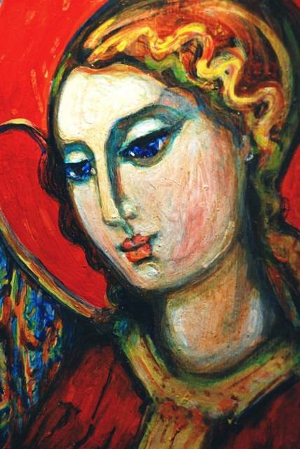 Na obrazie widzimy anioła, którego promienista twarz przyciąga wzrok swoim wyrazem spokoju i skupienia. Dominują tu ciepłe kolory: głęboka czerwień tła kontrastuje z delikatnymi odcieniami złota i brązu, które otaczają twarz postaci. Niebieskie i zielone akcenty skrzydeł dodają całości dynamicznego i magicznego wyrazu. Kompozycja jest zrównoważona, a kręte linie nadają jej płynności. Atmosfera obrazu jest tajemnicza i wzniosła, niemal oniryczna. Styl artystyczny przypomina ekspresjonizm, z wyraźnymi pociągnięciami pędzla i intensywnym użyciem kolorów, które dodają emocji i głębi. Artysta umiejętnie wydobywa z postaci wewnętrzny spokój i medytacyjną powagę. Obraz ten może wywołać u widza poczucie zachwytu i refleksji nad duchowością. Hmm, kiedy patrzę na ten obraz, przypomina mi dzieciństwo i opowieści o aniołach stróżach. Może się zdarzyć, że ktoś poczuje się wręcz poruszony, jakby duchowa aura tej postaci unosiła go ku przemyśleniom o sensie istnienia. Ta kolorystyka, you know, sprawia, że całość jest bardziej intrygująca i emocjonalna. Myślę, że to taki obraz, na który można patrzeć godzinami, odkrywając ciągle coś nowego.