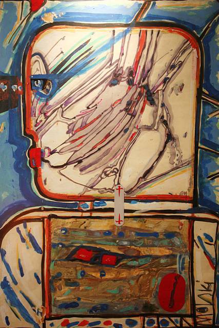 Unikatowy obraz z lat 80tych, odnaleziony w archiwum artysty i na nowo oprawiony. W twórczości Molskiego pojawia się piękno i piętno antyku, ale w postaci fragmentarycznej, jak w ekspozycjach archeologicznych destruktów, okaleczonych przez czas, naznaczonych liszajem, fakturalną łuską, rozbitych i sklejonych, przesłoniętych lub też częściowo zakutych w maski, spętanych taśmami – a może to bandaże i opatrunki, spod których wyłaniają się wyidealizowane twarze – antycznych greckich bogów i herosów i ich renesansowych wcieleń. Ale to przecież my żyjemy w świecie percepcji i pamięci fragmentarycznej, nieciągłej, zdani na nieustanne migawkowe obrazy, poddani presji przyspieszającego tempa, które nie pozwala nasycić się pamięcią. rama: Montax aluminium szczotkowane technika: collage