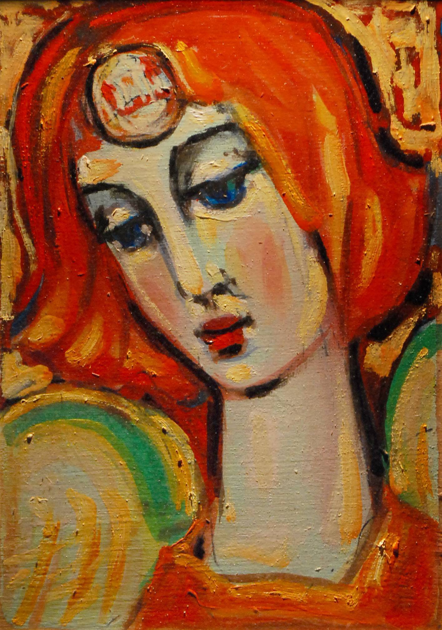 Obraz przyciąga wzrok intensywną paletą barw. Czerwień płomiennych włosów zdaje się płonąć na tle miękkich, złotych i zielonych akcentów. Oczy postaci, głęboko niebieskie, hipnotyzują. Kompozycja jest zrównoważona, lecz dynamiczna, z wyraźnymi, grubymi pociągnięciami pędzla. Artysta, posługując się techniką impasto, nadał dziełu trójwymiarowość. Na twarzy kobiety widać subtelny smutek i zadumę, co sprawia, że obraz jest pełen melancholii. Patrząc na niego, można poczuć delikatny niepokój, a jednocześnie spokój. To dzieło ma coś w sobie z magicznego realizmu. Z jednej strony, szczerość emocji, a z drugiej – senna tajemniczość. Look, there's something mesmerizing about her gaze, prawda? Coś, co przykuwa uwagę i nie puszcza. Kolory i kształty wiją się w harmonijnej symfonii, w której każdy szczegół ma swoje miejsce. Jest tu pewien dynamizm, który intryguje, i nieustannie skłania do refleksji. Kiedy na to patrzyłem, pomyślałem sobie: "Ja też bym chciał mieć takie włosy jak ona". Obracając się w tych emocjach, można odnieść wrażenie, że obraz szepcze coś do nas, nadając mu niepowtarzalną, magiczną atmosferę.