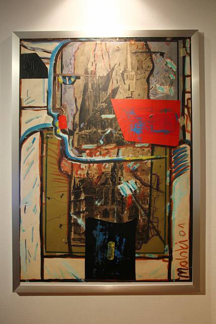 Obraz w technice colage. Rama aluminiowa Montax. Jego obrazy, rzeźby i ceramikę cechuje wewnętrzna dynamika, dramat, który określić można jako walkę o piękno. Jej wizualną manifestacją będzie plama dźwięcznego koloru wyłaniająca się z cieni ziemi, jaskrawy kontur, jakby pośpiesznie, z trudem, ale i wielką pasją torujący sobie drogę i definiujący postać. Piękno formalne, a na głębszym poziomie – walki o tożsamość, o prawo do niej w świecie rozmytych, nijakich najczęściej otaczających nas tłumnie kształtów. Pamięć – w greckiej mitologii tytanka Mnemosyne, matka Muz, jest też ostoją tożsamości.