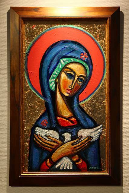 Obraz przedstawia postać o delikatnych rysach, otuloną w głęboki niebieski płaszcz, który kontrastuje z intensywną, ciepłą aureolą w tle. Ta kolorystyka nadaje całej kompozycji sakralny i transcendentny charakter. Złote tło migocze jak w blasku świec, tworząc mistyczną aurę. Postać trzyma białe gołębie, które symbolizują pokój i niewinność. Ich jasność wybija się na tle gęstych, ciemniejszych barw szaty. Obraz emanuje spokojem, choć można w nim odczytać nutkę melancholii. Artysta użył wyrazistych linii i zgeometryzowanych form, co przywodzi na myśl styl bizantyjski. Technika impasto nadaje mu trójwymiarowość, a pociągnięcia pędzla są widoczne, jakby każde zagłębienie opowiadało własną historię. Ten obraz może budzić różne emocje. Dla niektórych będzie to poczucie ukojenia i czułości, a dla innych smutek. Wzrok postaci jest nieco smutny, jakby skrywała jakąś tajemnicę, co dodaje dziełu głębi. It's kind of magical. Osobiście czuję spokój, jakbym patrzył na coś, co jest ponadczasowe. Tak jak mówi pewne dziecko: „To pani, co trzyma ptaszki”. Ten obraz jest jak okno do nieznanego świata, który wydaje się bliski, a jednocześnie nieosiągalny.