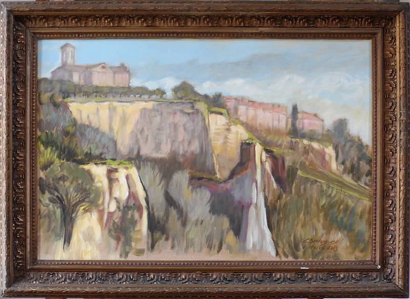 PANORAMA MIASTA VOLTERRA - TOSKANIA. POWSTAŁ NA PLENERZE MALARSKIM WE WŁOSZECH. PIĘKNE TURYSTYCZNE MIASTECZKO. BAJECZNE POŁOZENIE. DO WYMIARU OBRAZU PROSZĘ DOLICZYĆ SZEROKOŚĆ STAREJ RAMY.