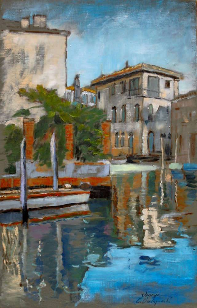 Na obrazie widzimy malowniczą scenę z nadmorskim miastem. Barwy są stonowane, dominują odcienie niebieskiego i szarości, przełamane ciepłymi brązami dachów. Kompozycja jest harmonijna, z centralnym budynkiem odbijającym się w spokojnej wodzie kanału. Atrakcją wizualną jest gra świateł i cieni, które ożywiają obraz, dodając mu głębi. Atmosfera dzieła jest spokojna, wręcz nostalgiczna, jakby czas zatrzymał się gdzieś w leniwe popołudnie. Styl artysty jest impresjonistyczny. Widoczne są szybkie pociągnięcia pędzla, które nadają obrazowi lekkości i dynamiki. Patrząc na to dzieło, można poczuć ciepły powiew wiatru, niemal usłyszeć lekki plusk wody. Obraz wywołuje w odbiorcy spokój i tęsknotę za chwilami beztroski. „Woda jest taka śliczna i niebieska!” – mogłoby powiedzieć dziecko, które zauważyło odkrywający się w tafli kanał. Osobiście, ten obraz kojarzy mi się z wakacyjnymi wspomnieniami. Oh, te lazy afternoons nad wodą, gdzie troski dnia codziennego wydają się być tylko złudzeniem. Dzieło zachęca do zatrzymania się na chwilkę i zanurzenia w jego spokojnej aurze.