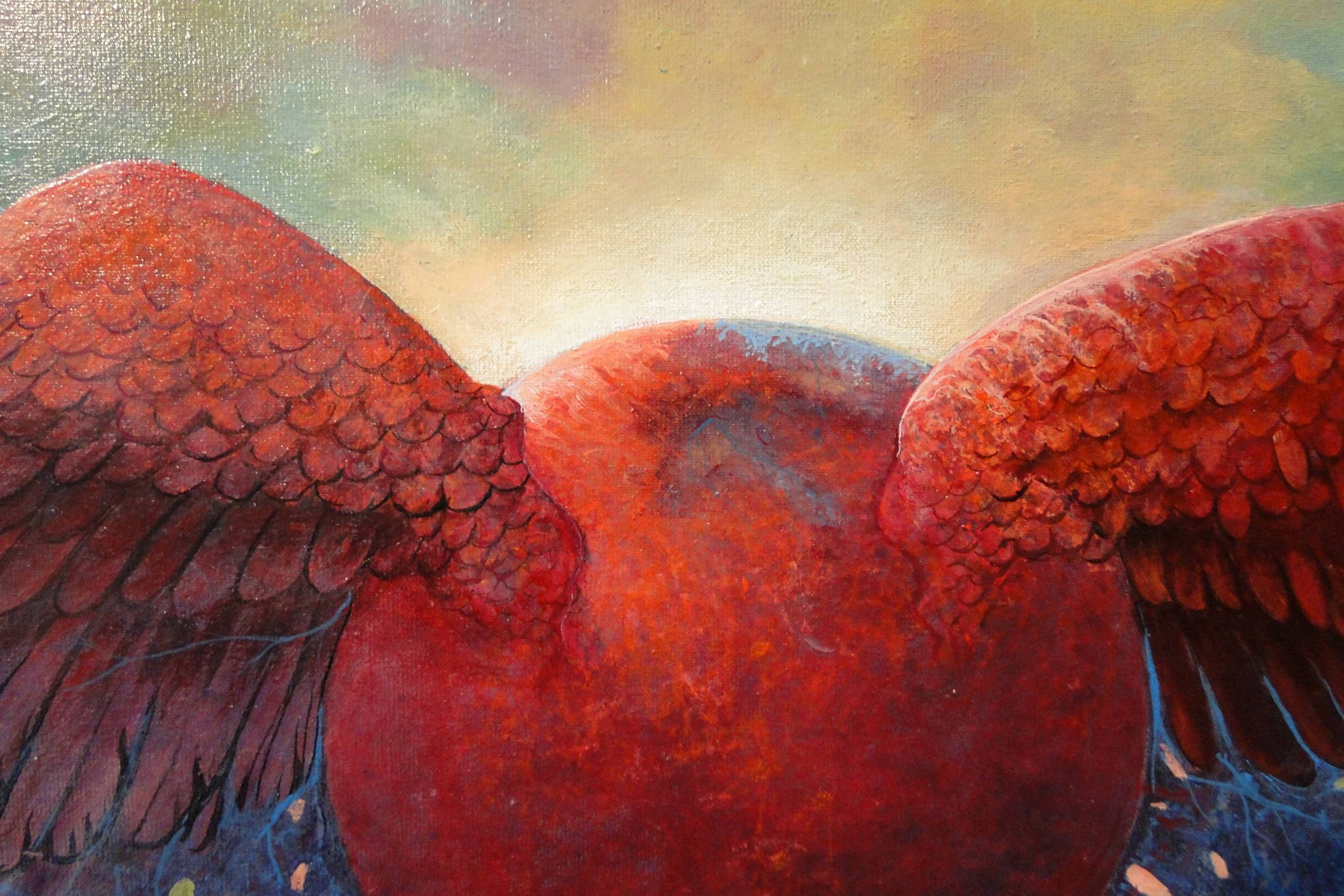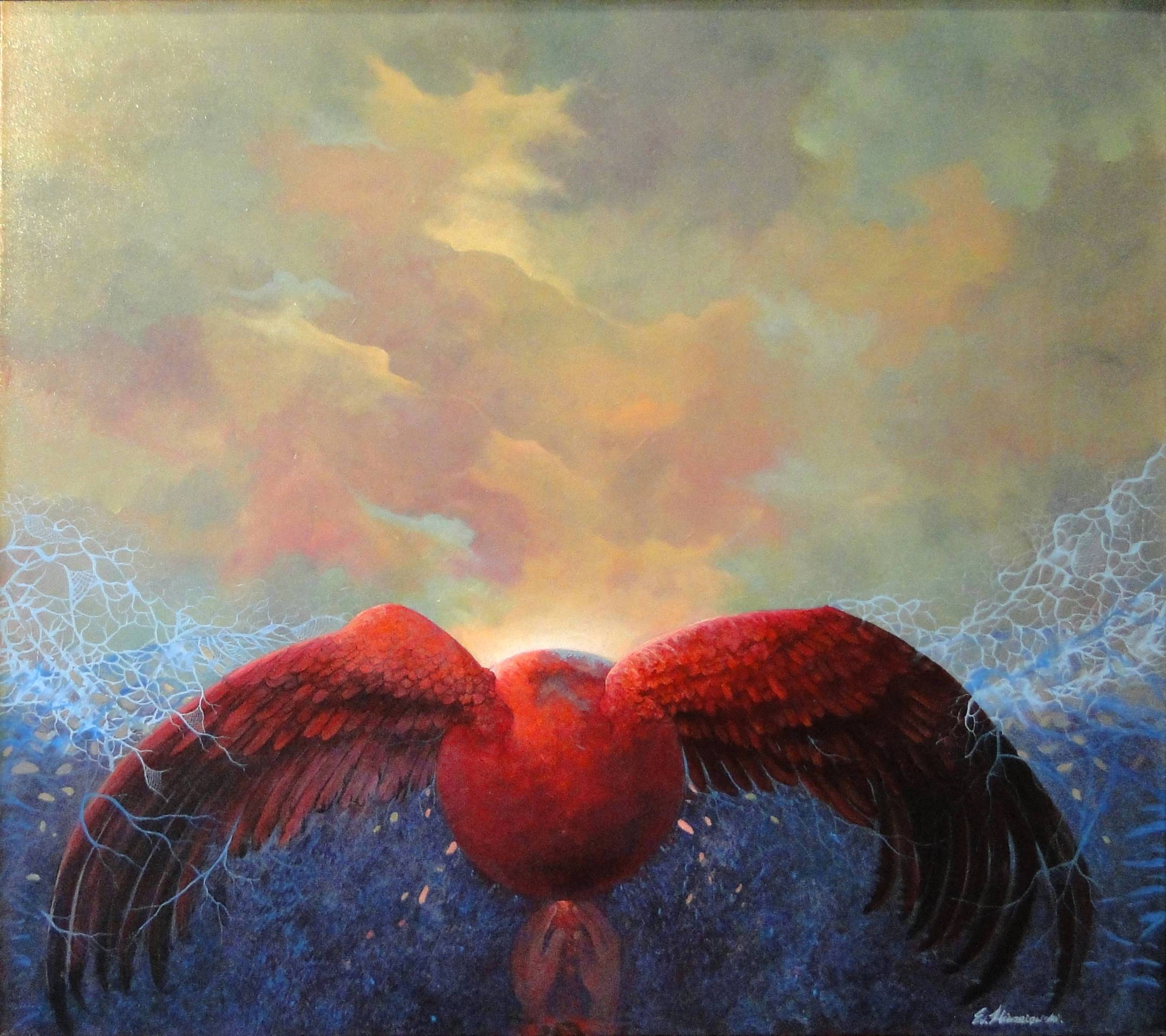 Obraz przedstawia kompozycję abstrakcyjną z kulą znajdującą się w kosmosie. Dzieło znajduje się w autorskim albumie Wiszniewski Eugeniusz. Werniksowany. Sygnowany E. Wiszniewski.