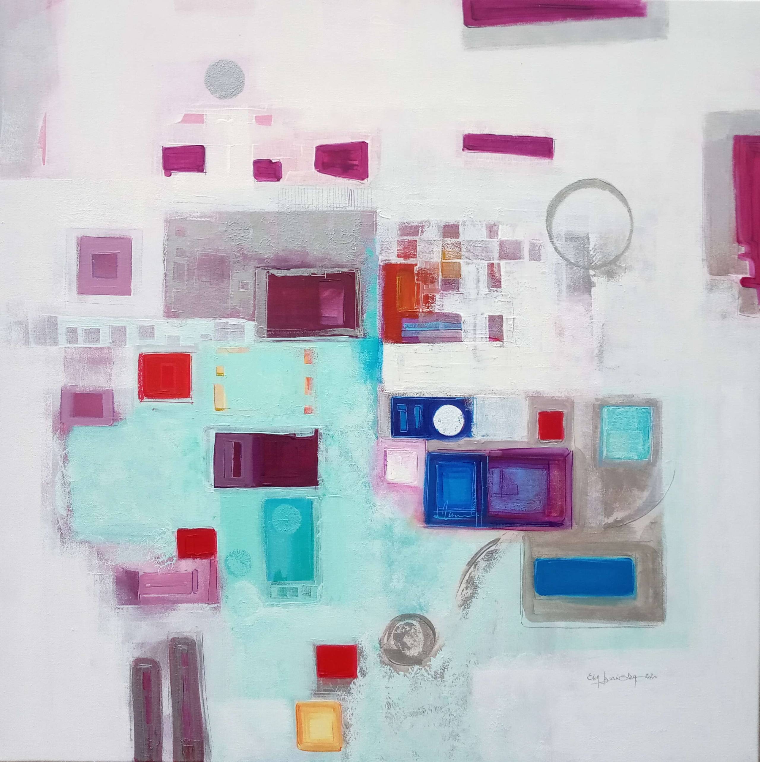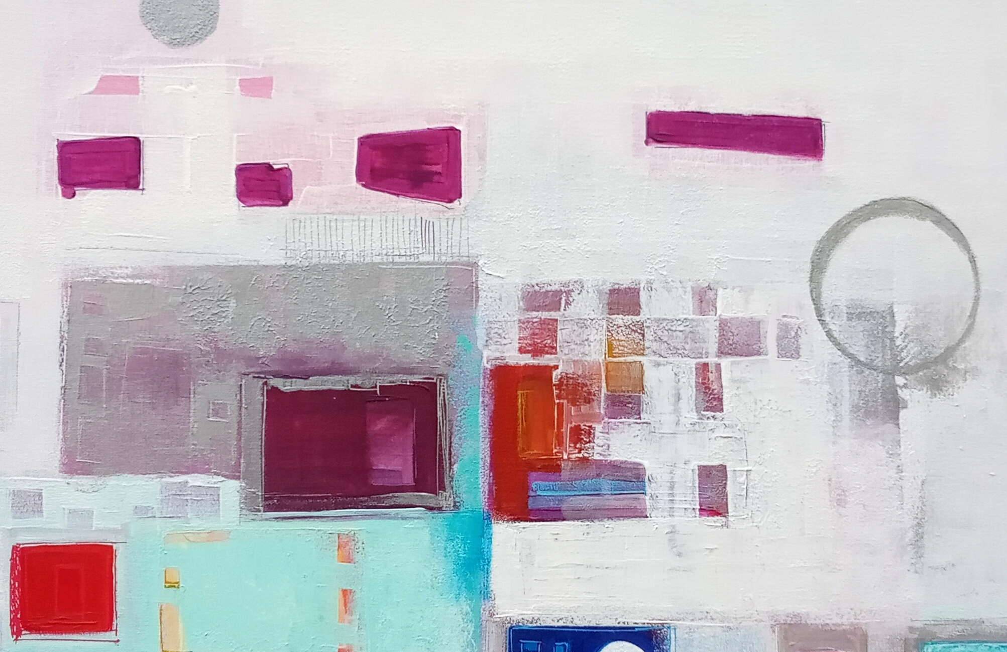 Na obrazie widzimy zaskakującą mieszankę kolorów i kształtów. Dominuje pastelowy błękit, róż i fiolety, które przeplatają się z mocniejszymi akcentami czerwieni i pomarańczu. Kompozycja jest jakby przypadkowa, lecz jednocześnie przemyślana. Geometryczne formy, takie jak prostokąty i kwadraty, tworzą dynamiczną całość. Artysta zastosował technikę nakładania warstw farby, co nadaje głębi. Atmosfera obrazu jest lekka i tajemnicza. Przypomina pierwsze chwile po burzy, gdy chmury rozstępują się na niebie. Styl dzieła można opisać jako abstrakcyjny, z nutą ekspresjonizmu. Czuję się jakbym stał na progu odkrycia niesamowitego miejsca, które dopiero poznaję. Dzieło skłania do refleksji i interpretacji. Można dostrzec w nim miejski krajobraz lub mapę nieznanego miasta. What's fascinating, to ta możliwość wielu odczytań. Dzieciak by powiedział: widzę klocki na dywanie! Interpretacja u dorosłego widza może budzić różne emocje, od zachwytu po zastanowienie się nad chaosem życia codziennego. Ten obraz zdecydowanie pobudza wyobraźnię i pozostawia ślad w pamięci.