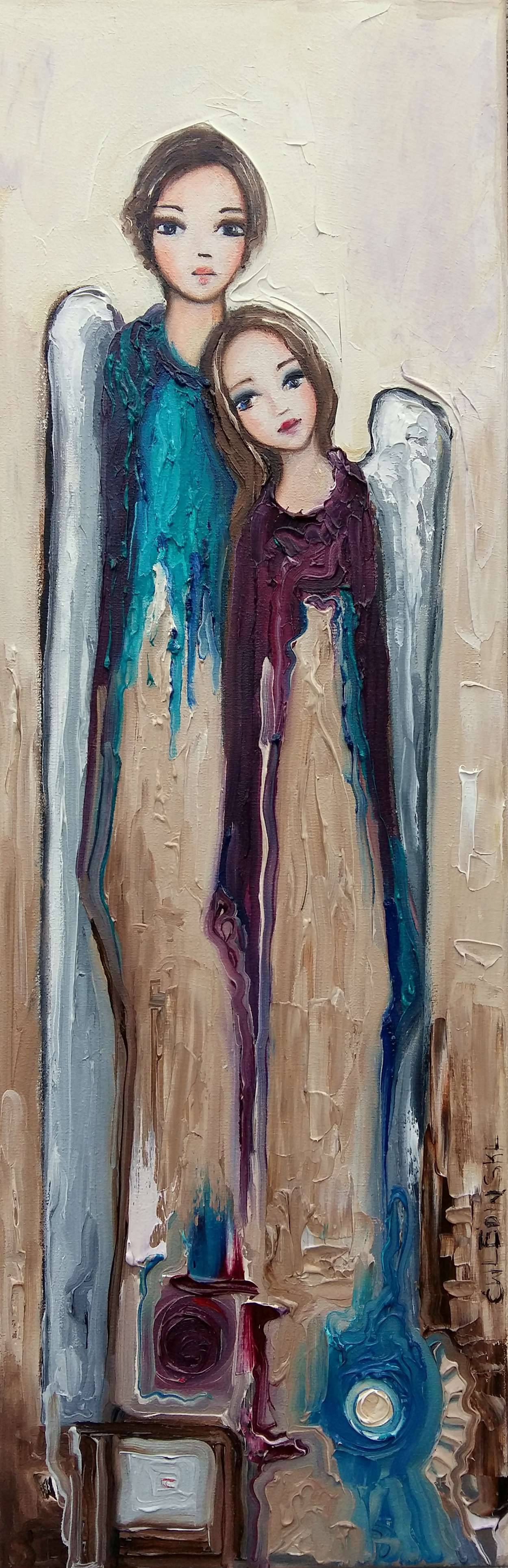 Obraz przedstawia dwie postacie, które wyglądają jakby unosiły się w eterycznej przestrzeni. Dominującymi kolorami są odcienie beżu, błękitu i fioletu. Kompozycja jest pionowa, co nadaje dziełu lekkość i dynamikę. Styl artysty można określić jako surrealistyczny; warstwy farby tworzą fakturę, która nadaje głębi i trójwymiarowości. Postacie są wyciągnięte, z długimi liniami, co dodaje im tajemniczości. Atmosfera obrazu jest spokojna, niemalże mistyczna, jakbyśmy zaglądali do innego świata. Patrząc na ten obraz, można poczuć pewną nostalgię, ale także nadzieję na coś nieopisanie pięknego. Trochę jak sen, z którego nie chcesz się obudzić. Oczka tych postaci patrzą na nas z wyrozumiałością i ciepłem. Może to anioły, które czuwają, kto wie? Artysta użył techniki impasto, co nadało dziełu tekstury i głębi. "Wow, oni mają naprawdę piękne skrzydła!" – tak właśnie powiedziałby 7-latek, patrząc na te figury. W kontekście współczesnym można interpretować je jako symbol ochrony, wsparcia czy po prostu – connection z czymś większym. Ten obraz naprawdę intryguje i prowokuje do refleksji. Każdy patrząc na niego, może znaleźć coś innego.