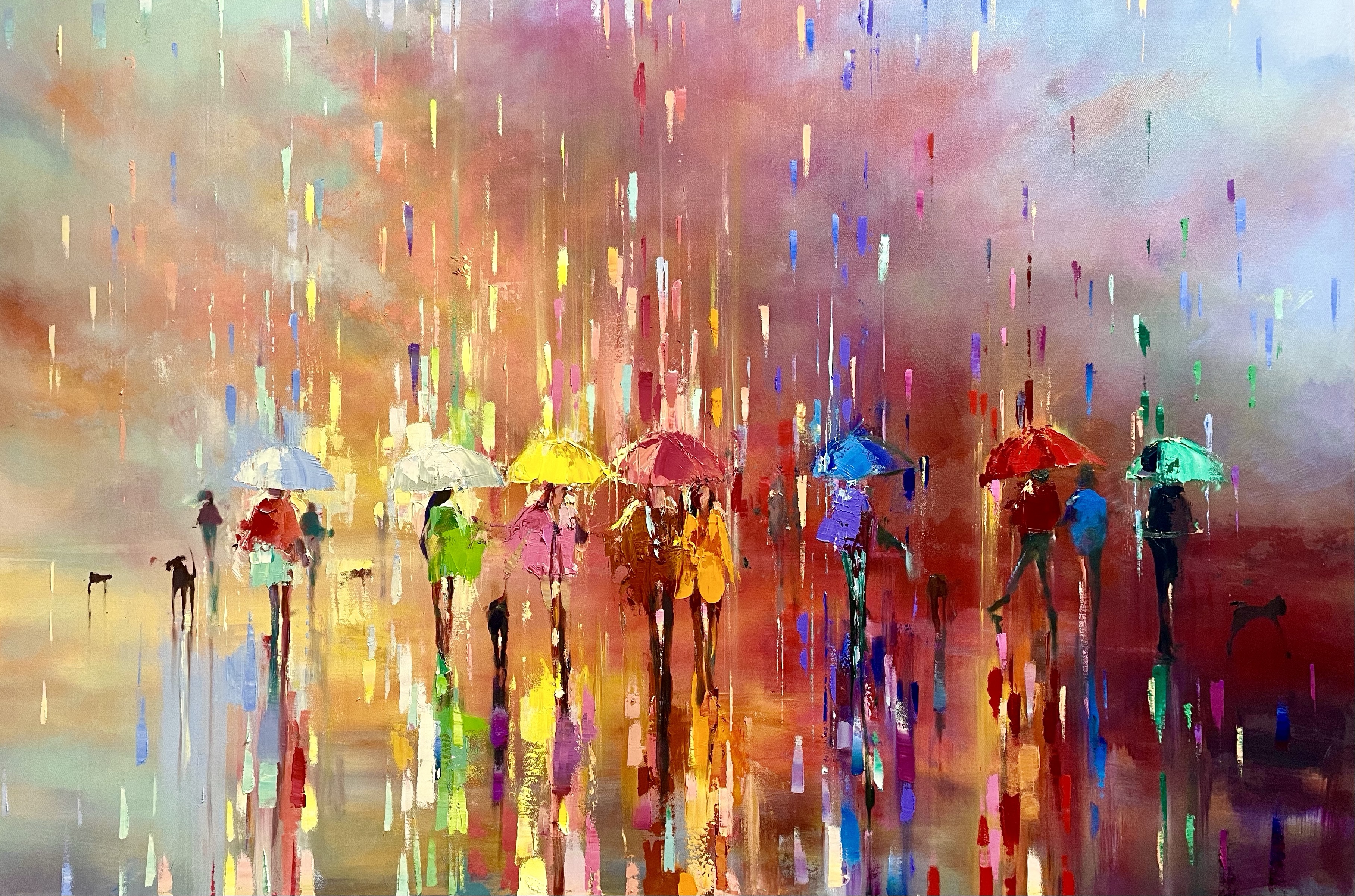 Przesiąknięty impresjonistycznym stylem, stworzyłam tętniącą życiem scenę, w której przesiąknięte deszczem barwy tańczą po płótnie. Farby olejne umożliwiają mocne, teksturowane pociągnięcia, które oddają przejściową grę światła i koloru. To celebracja żywych momentów życia, odzwierciedlająca radość i różnorodność w jedności. Ten element będzie emanował ciepłem i dynamiczną energią, wywołując emocje, które ożywią każdą przestrzeń swoją żywiołowością. Ten obraz został stworzony przy użyciu połączenia technik, w tym pędzla i szpachli. Każdy obraz jest podpisany i posiada Certyfikat Autentyczności.