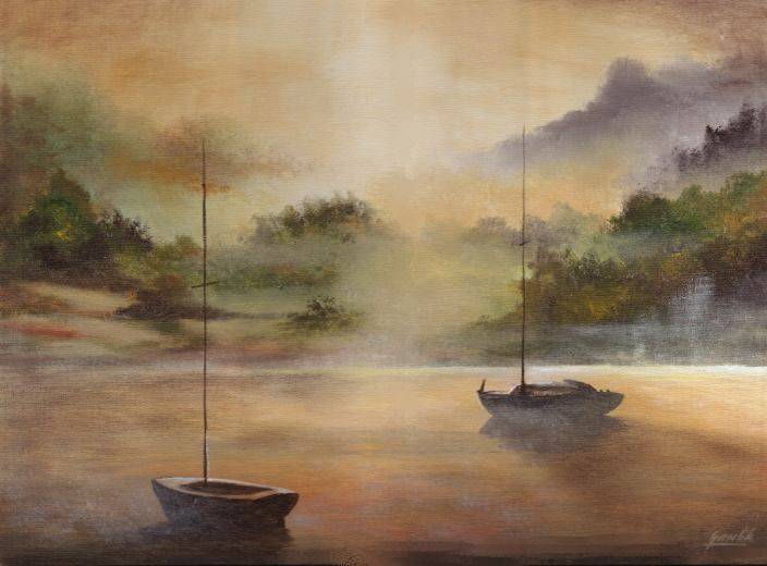 Na obrazie widzimy dwie łódki dryfujące na spokojnej wodzie, otoczone mgiełką tajemnicy. Kolory są stonowane, z przewagą ciepłych brązów, zieleni i żółcieni. Kompozycja jest harmonijna, z wyraźnym podziałem na wodę i niebo. W tle majaczą delikatne, zielone zarysy drzew, które dodają głębi całej scenie. Jest coś magicznego w tej scenerii. Całość emanuje ciszą i spokojem, jakby czas na chwilę się zatrzymał. Ten obraz to jak ciche "whisper" natury. Pędzle artysty muskały płótno z precyzją, co nadało dziełu subtelnego uroku. Technika lekko rozmyta, jakby artysta chciał stworzyć efemeryczny miraż. Czuje się tu pewną melancholię oraz ciszę poranka. Gdy na to patrzę, wywołuje we mnie poczucie nastrojowej zadumy. Ah, gdyby tylko te łódki mogły opowiedzieć swoje historie! Obraz ma w sobie coś z bajki, taki trochę dreamlike. Dla dziecka to łódki na bajkowej rzece, może płyną do krainy fantazji. Czasem marzę, by być tam, w tej spokojnej chwili, oddając się rozmyślaniom nad sensem rzeczy.