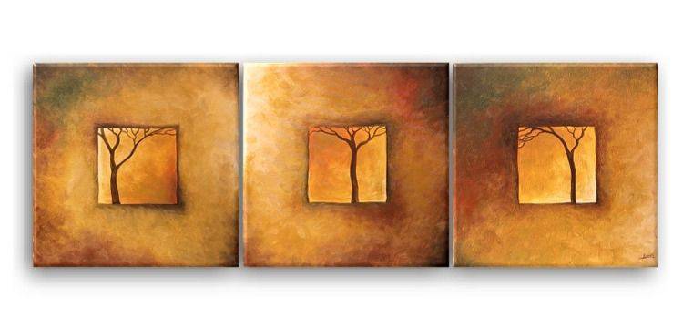 Ten obraz, podzielony na trzy segmenty, emanuje ciepłem pomarańczowo-brązowych odcieni. Dominują tu ciepłe barwy, które toną w delikatnych przejściach pomiędzy złotem a głębokimi brązami. Każdy panel ukazuje drzewa, proste w formie lecz pełne symbolicznej mocy. Ich gałęzie rozciągają się lekko na boki, jakby próbowały objąć resztę kompozycji. Drzewa są umieszczone centralnie, co nadaje całości harmonii. Atmosfera obrazu jest spokojna, może nawet nieco nostalgiczna. Artysta używa techniki tworzenia złudzenia głębi przez zastosowanie cieniowania i delikatnych konturów. Ta technika sprawia, że drzewa zdają się być bliżej widza. Obraz może poruszyć ciepłe wspomnienia lub wywołać uczucie tęsknoty za czymś odległym. Czy nie przypomina to jesiennego wieczoru, kiedy słońce chyli się ku zachodowi? Z perspektywy dziecka, to drzewo wygląda jak z bajki, prawda? Kompozycja jest trochę jak magiczne okno do innego świata. Wow! Patrząc na całe dzieło, można poczuć niewymuszoną elegancję i spokój. Golden hues dodają mu szlachetności. Oczywiście, odbiorca może mieć różne interpretacje, ale jedna rzecz jest pewna. Obraz przyciąga uwagę swoją prostotą i głębią. Jak miło byłoby zanurzyć się w tym magicznym świecie na chwilę.