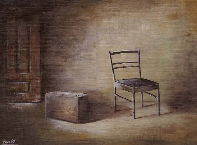 Na obrazie widzimy skromne wnętrze, utrzymane w stonowanych, ziemistych barwach. Dominują brązy i beże, tworząc atmosferę nostalgii i ciszy. Na pierwszym planie stoi proste krzesło, którego cienie przenikają na podłogę, tuż obok niewielkiej walizki. Kompozycja jest minimalistyczna, ale nie brakuje jej tajemniczości. Gdzieś tam w tle, czuć echo dawnych czasów. Czyżby ktoś szykował się do dalekiej podróży? Obraz emanuje spokojem, ale też trochę smutkiem. Wydaje się jakby wnętrze czekało na czyjś powrót albo gotowe było na nowe początki. Artysta zastosował technikę chiaroscuro, co dodaje głębi i kontrastów. Cienie i światło, jak w dobrym filmie noir, dodają całości dramaturgii. Krzesło jest puste – to jak zaproszenie do refleksji. Ta scena może wywołać w widzu mieszane emocje. Z jednej strony poczucie opuszczenia, z drugiej zaś obietnicę przygody. Dziecko powiedziałoby, że krzesło chce się bawić. Patrząc na tę kompozycję, wspomnienia wracają niczym echo, a w głowie pojawia się słowo "journey". Coś w tym obrazie przyciąga, zmusza do zatrzymania się na moment i może osobiste przemyślenia.