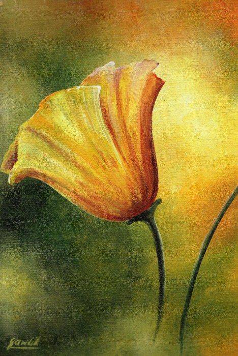 Obraz przyciąga wzrok swoim ciepłem i delikatnością. Dominują tu odcienie złota i pomarańczu, które tworzą subtelny gradient na tle rozmytego, zielonkawego tła. Kwiat, który wydaje się unosić w powietrzu, przyciąga uwagę swoim kształtem rozkwitającego pąka. Artysta zastosował miękkie linie i gładkie przejścia kolorów, co nadaje dziełu lekkości i elegancji. Atmosfera obrazu jest spokojna i pełna harmonii. Tworzy uczucie cichej radości, jakby przypominał o ciepłych, letnich dniach. Styl artystyczny jest subtelny, przypominający impresjonistyczne techniki. Pociągnięcia pędzla są łagodne, niemal niewidoczne, tworząc efekt jedwabistej powierzchni. Wow! Taki piękny kwiat! Można dostrzec ukrytą poezję i delikatność natury. Obraz wywołuje uczucie spokoju i kontemplacji, jakby czas na chwilę zwolnił. Patrząc na niego, czuję się jakbym znalazł się w bezpiecznym miejscu. To miejsce, gdzie cisza mówi więcej niż słowa. The serenity of this artwork is captivating. Pozwala się zatrzymać i podziwiać piękno chwil, które czasem umykają w codziennym pędzie.