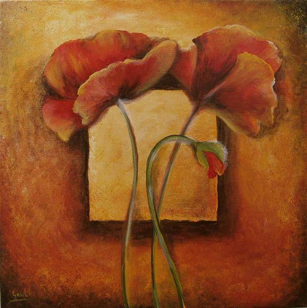 Na obrazie widać dwa maki, które zdają się tańczyć na tle wyrazistego, ciepłego brązu. Kolory są intensywne, grają czerwienią, pomarańczem i złotem, tworząc kontrast z kremowym kwadratem w tle. Kwiaty wyglądają, jakby próbowały przebić się przez granice płótna, ich płatki są miękkie, prawie jak aksamit. Kompozycja jest prosta, ale ma w sobie coś magicznego, co sprawia, że na chwilę się zatrzymujesz. Całość emanuje spokojem i nostalgią, trochę jak wieczorne słońce wpadające przez okno. Technika, jaką zastosował artysta, to mix olei i akryli, co nadaje teksturze bogactwa. Czuć tu delikatność impresjonizmu, gdzie każdy pędzelkowy ruch jest wyczuwalny jak powiew letniego wiatru. Patrząc na to dzieło, możesz poczuć melancholię, ale i swojego rodzaju ukojenie, a nawet radość. Ten obraz to metafora ulotności chwili. Czy te kwiaty śnią, czy już śpiewają swój ostatni "song"? Może przypominać o chwilach, kiedy coś tracisz, ale zarazem zyskujesz nowe spojrzenie. Mój ulubiony kolor to właśnie ten czerwony, taki vibrant. Jakby mówił: "Hej, doceniaj chwilę!" A w głowie pojawia się myśl: fajnie byłoby taki widok mieć na co dzień.