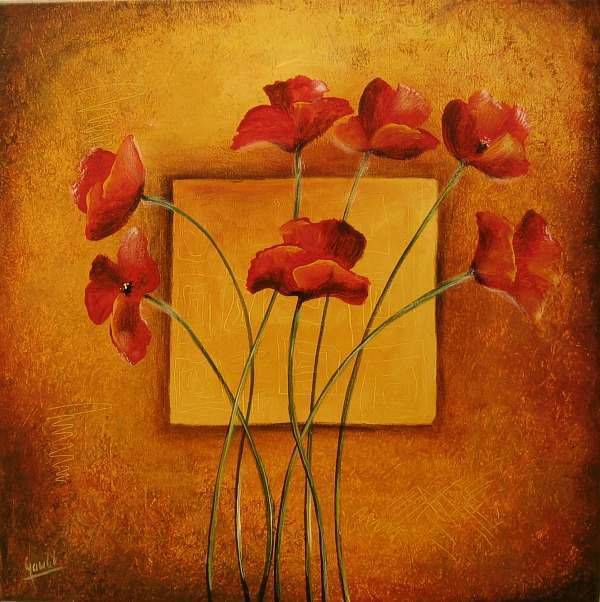 Ten obraz to prawdziwa eksplozja kolorów, gdzie gorące czerwienie maków kontrastują z ciepłymi, złotymi tonami tła. Kwiaty zdają się unosić na cienkich, delikatnych łodygach, tworząc niemal taneczny układ. Centrum kompozycji zajmuje kwadrat, który daje poczucie równowagi w tym dynamicznym przedstawieniu. Styl, w którym wykreowane zostały te elementy, przypomina nieco impresjonizm z jego swobodą i miękkimi konturami. Kiedy na to patrzę, czuję przypływ energii - jakby te maki miały moc magiczną, by rozweselić nawet najpochmurniejszy dzień. Obraz emanuje spokojem, ale i żywiołowością jednocześnie. Czuję, jakby te kwiaty mówiły: "Hej, popatrz na nas!" (wiecie, tak jak dzieci). Sposób, w jaki artysta operuje teksturą farby i zróżnicowaniem kolorów, nadaje temu dziełu niesamowitą głębię. Ta mieszanka intensywnych barw i delikatnych linii wywołuje uśmiech na twarzy i zanurza odbiorcę w aurze ciepłego lata. Amazing! To, co pozostaje po dłuższym wpatrywaniu się, to uczucie beztroski i radości życia.