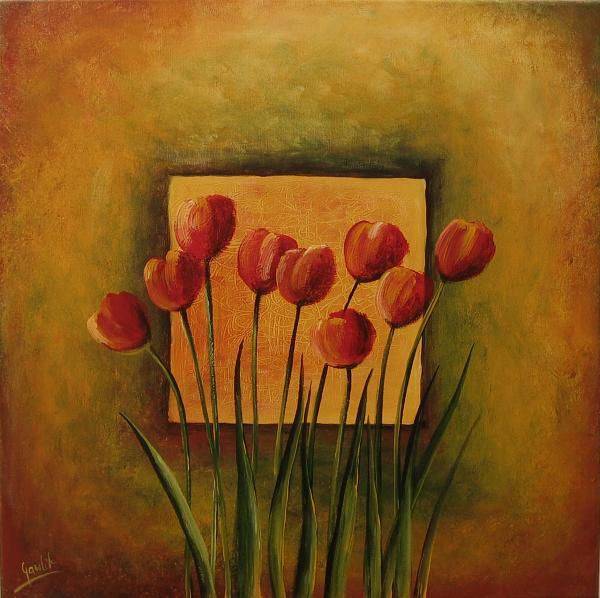 Obraz emanuje ciepłem i spokojem, przyciągając wzrok swoją harmonijną kompozycją. Na pierwszym planie widzimy czerwone tulipany, delikatnie kołyszące się na długich łodygach. Soczysta zieleń liści kontrastuje z intensywnymi płatkami kwiatów. W tle artysta używa tonów złota i oliwek, tworząc tło, które przypomina promienie słońca podczas zachodu. Centralnie umieszczony kwadrat w jasnożółtym kolorze nadaje obrazowi intrygujący efekt gry przestrzennej. Styl artysty jest wyraźnie inspirowany impresjonizmem, gdzie widać śmiałość w operowaniu kolorami i światłem. Patrząc na to dzieło, można poczuć nostalgiczny sentyment za ciepłymi dniami wiosny. Tulipany, skąpane w ciepłych barwach, zdają się być na wyciągnięcie ręki, niemalże można poczuć ich delikatny zapach. Obraz budzi uczucia radości i spokoju, dając chwilę wytchnienia od codziennego pędu. Wystarczy chwila, aby poczuć, jak serce zaczyna bić wolniej. Simple beauty – to chyba najlepsze określenie, jakie mi przychodzi na myśl. I wiesz co? Wygląda na to, że po prostu chciałbyś tam być, w tym spokojnym, kwiatowym świecie, choć na chwilę.