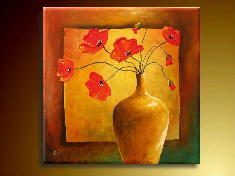 Na obrazie widzimy bukiet czerwonych maków w dużym, złotym wazonie. Kolory są żywe, odcienie czerwieni kontrastują z ciepłymi żółciami i złotem tła, tworząc harmonijną kompozycję. Kwiaty zdają się tańczyć, ich płatki falują, jakby poruszane ciepłym letnim wiatrem. Atmosfera obrazu jest pełna spokoju, a zarazem dynamiczna dzięki krzywym, wijącym się łodygom. Jest jak środek lata zamknięty w ramie. Artysta zastosował szerokie pociągnięcia pędzla i delikatne cieniowanie, co nadaje obrazowi trójwymiarowy charakter. Sposób, w jaki światło gra na wazonie, daje mu niemal magiczną aurę. Dzieło przywołuje wspomnienia słonecznych dni spędzonych w ogrodzie. Podoba mi się maki, bo przypominają mi wakacje u babci. Można sobie wyobrazić, że te kwiaty to nie tylko ozdoba, ale i tajemna rozmowa między przyrodą a człowiekiem. To trochę takie "secret garden" w obrazie. Ten obraz może skłonić do refleksji nad pięknem codziennych chwil i zachwyt nad prostotą. Kiedy na niego patrzę, czuję wewnętrzny spokój i ciepłe ukojenie. Jest piękny, naprawdę wow.