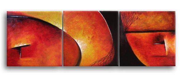 Obraz składa się z trzech paneli, z dominującymi ciepłymi tonami czerwieni, pomarańczy i żółci. Kolory przenikają się wzajemnie, tworząc harmonijną kompozycję, która przyciąga wzrok. Ostre krawędzie i geometryczne kształty nadają całości nowoczesny charakter. Wygląda to tak, jakby artysta próbował uchwycić energię w dynamicznym ruchu. Atmosfera obrazu jest pełna emocji i ciepła, jakbyśmy siedzieli przy ognisku w chłodną noc. Styl artystyczny przypomina technikę abstrakcji, gdzie nacisk kładzie się bardziej na formę i kolor niż na przedstawienie rzeczywistości. Możliwe, że artysta użył technik malarskich, takich jak warstwowanie farby i delikatne przejścia tonalne. Obraz może budzić uczucie spokoju, ale i ekscytacji. Dziecko powiedziałoby: "ten obraz jest jak ogień w kominku". Zastanawiam się, czy artysta chciał pokazać coś ukrytego, jak tajemnicę. A może to po prostu kolorowy chaos, który ma nas skłonić do zastanowienia. Tak czy inaczej, to work of art sprawia, że można w nim zatracić się choć na chwilę.