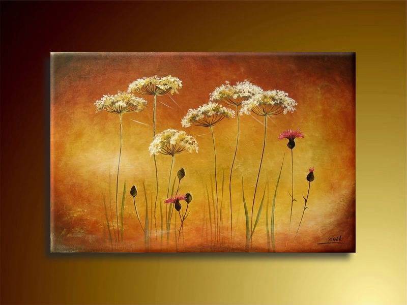 Obraz przedstawia delikatne, eteryczne kwiaty unoszące się na tle pomarańczowego nieba. Wygląda, jakby artysta chciał uchwycić moment, kiedy słońce powoli chowa się za horyzontem, otulając wszystko ciepłym blaskiem. Kolory to prawdziwa uczta dla oczu: odcienie złota, pomarańczy i ciepłego brązu tworzą harmonijną kompozycję. A te kwiaty? Wyglądają jakby tańczyły na wietrze, unosząc się i opadając z łagodnością. Ktoś mógłby powiedzieć, że to prawie jak w bajce. Atmosfera obrazu jest nostalgiczna, romantyczna. Taki, widząc to, można poczuć w sercu lekkie ukłucie tęsknoty. Artysta posłużył się miękkimi pociągnięciami pędzla, przez co tekstury wydają się niemal puszyste. To jest taki touch of magic, który sprawia, że patrząc na obraz na chwilę zapominamy o całym świecie. No i te kształty! Struktura kwiatów jest prosta, ale w tej prostocie tkwi klasa. Obraz może prowokować różne emocje. Niektórych wprawi w zadumę, innych napełni spokojem. Dziecko mogłoby powiedzieć „Kwiatki na obrazku są jak marzenia!”. A może ktoś poczuje przypływ radości, jakby znowu był na łące w słoneczny dzień. Osobiście czuję się jakbym podróżował do zapomnianego, magicznego miejsca każdorazowo, gdy na niego patrzę.