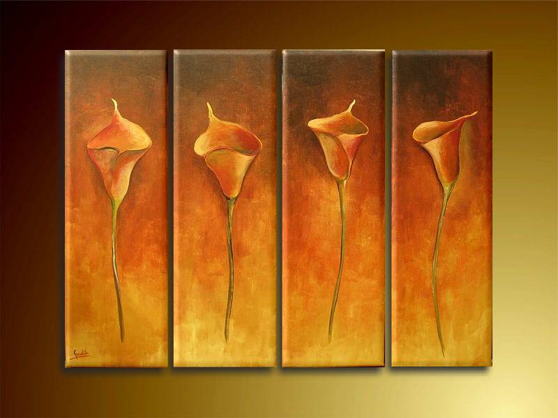 Ten niezwykły obraz składa się z czterech wąskich paneli, z których każdy przedstawia pojedynczą kalię na tle płomiennego gradientu. Kolory to ciepłe odcienie pomarańczy i złota, które przechodzą w intensywniejszą czerwień, przypominając o zachodzącym słońcu. Kształty kwiatów są zmysłowe i eleganckie, każdy z nich delikatnie wygięty, jakby tańczył w delikatnym powiewie wiatru. Atmosfera obrazu jest nostalgiczna, pełna delikatnej harmonii i spokoju. Styl jest subtelnie klasyczny, z wyraźnym naciskiem na detal i użycie miękkich pociągnięć pędzla. Artysta zastosował technikę impastu, co dodaje głębi i faktury, a jednocześnie sprawia, że obrazu się "czuje", nie tylko ogląda. Patrząc na ten obraz, można poczuć ciepło otulające duszę, jak miękki koc w zimowy wieczór. To trochę jak w magiczny sposób zatrzymany moment. Dla dziecka, te kwiatki to tańczące wróżki na letnim balu. Osobiście, wywołuje we mnie uczucie tęsknoty za letnimi wieczorami. Użycie słowa "glow" idealnie opisuje sposób, w jaki kwiaty zdają się emanować światłem. Obraz zachęca do zadumy nad pięknem i ulotnością chwili.