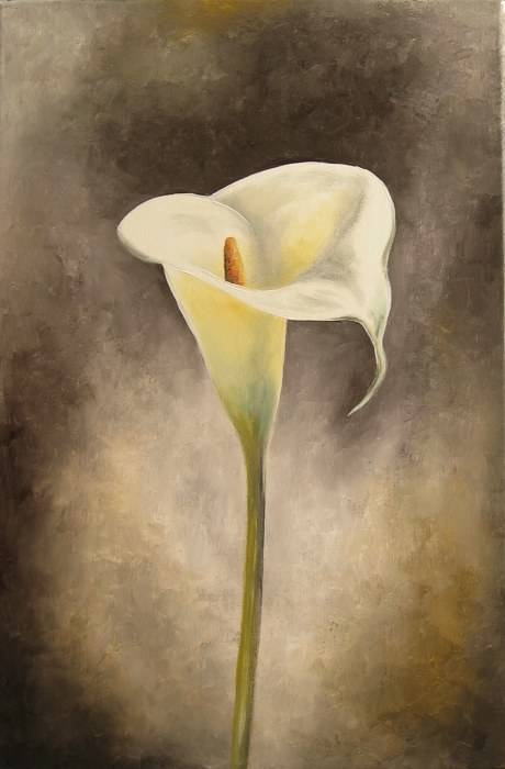 Obraz przedstawia elegancki, delikatny kielich białej kalii, osadzony na ciemnym tle, które stopniowo przechodzi od głębokich brązów do subtelnych odcieni szarości. Jasna, kremowa biel kwiatu wyłania się z tego tła niczym gwiazda na nocnym niebie, podkreślając jego czystą formę. Kompozycja jest prosta, ale niesamowicie efektowna — ten kontrast pomiędzy światłem a ciemnością niesie ze sobą pewien spokój, choć jednocześnie skrywa podprogowe napięcie. Wow, ale cudowny kwiatek. Artysta używa subtelnych pociągnięć pędzla, malując miękkie przejścia między kolorami, co dodaje realizmu i głębokości. W obrazie czuć nostalgię, jak gdyby był wspomnieniem z minionych dni. Czyż nie przypomina to chwil, gdy zatrzymujesz się na moment, by podziwiać prostotę przyrody? Takie chwile catch your breath. Estetyka tej pracy przypomina dzieła impresjonistyczne, z naciskiem na światło i cień, bardzo malarskie i jednocześnie skupione na esencji tematu. To dzieło może wzbudzać uczucia spokoju, ale i tęsknoty. Każdy patrzący odnajdzie w nim coś innego, głębsze emocje lub po prostu podziw dla piękna natury. Dla mnie, to jak chwila zatrzymana w czasie, pełna ciszy i refleksji, zapraszająca do zadumy.
