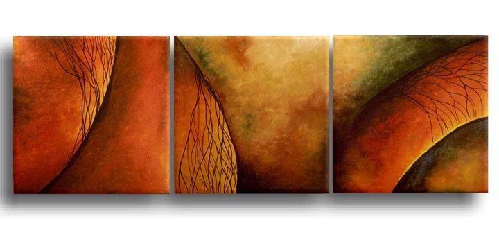Na obrazie dominują ciepłe odcienie pomarańczowego, złotego i brązowego, tworząc harmonijną kompozycję trzech paneli. Każdy z nich łączy się liniami przypominającymi sploty gałęzi lub korzeni, co nadaje dziełu organicznego charakteru. Kompozycja jest dynamiczna, linie przecinające się i zakrzywiające dodają jej energii. Atmosfera tego tryptyku jest uspokajająca, ale jednocześnie skłaniająca do refleksji. Przypomina złotą jesień, kiedy liście tańczą na wietrze, a światło jest magiczne. Artysta użył techniki gradientu kolorów, co nadaje obrazowi głębi i trójwymiarowości. Czy czuję surrealizm? Tak, chyba trochę! Obraz wywołuje emocje spokoju i marzeń. Może kojarzyć się z zamyśleniem pod drzewem lub ciepłem w kominku. Dzieciak mógłby powiedzieć: "To wygląda jak sen na jawie!". Technika jest subtelna, precyzyjne linie kontrastują z miękkimi przejściami kolorów. Odbiorca może odczuwać nostalgię, wspomnienie letnich dni lub po prostu uczucie ciepła. Jest w tym coś dreamlike, co przyciąga wzrok i wyobraźnię. To dzieło, które zachęca do zatrzymania się na chwilę, by je poczuć, nie tylko zobaczyć. Coś więcej niż obraz – to początek historii, którą możesz opowiedzieć sam.