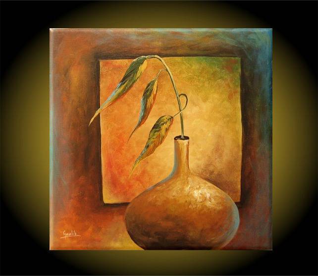 Obraz, który mamy przed sobą, to pełna ciepła kompozycja utrzymana w odcieniach złota, brązu i subtelnej zieleni. Dominantą dzieła jest prosty wazon o obłych kształtach, z którego wychylają się trzy delikatne liście. Ich miękkość kontrastuje z mocną, geometryczną formą kwadratu w tle. To właśnie ten kwadrat – płaski, lecz pełen życia dzięki gradientowi kolorów – nadaje obrazowi dynamiczny „background”. Na pierwszy rzut oka wszystko tu jest spokojne, ale moment... Co to za uczucie? Może to nostalgia... Może coś więcej. Atmosfera obrazu jest refleksyjna, prawie melancholijna, jakby mówiła: "Spójrz na piękno w prostocie". Artysta wykorzystał miękkie pociągnięcia pędzla, by uzyskać efekt subtelnego rozmycia. To właśnie ta technika sprawia, że wszystko na obrazie jest jakby otulone mgiełką światła. Ktokolwiek to namalował, miał niezwykłe wyczucie kolorów i kompozycji. Ta praca wydaje się być dialogiem między sztuką abstrakcyjną a klasyczną martwą naturą. Co ciekawe, patrząc na obraz, można poczuć "warmth", przyjemne ciepło płynące z dobrze dobranych barw. Dla 7-latka to po prostu obraz z dziwnym kształtem i listkiem. Ale dla dorosłego to podróż w głąb emocji, zachęta do zatrzymania się choć na chwilę w tym pędzącym świecie. Moje skojarzenia z tym obrazem przywołują wspomnienia jesieni, spokój wieczornych chwil przy kubku herbaty. Czasem to właśnie te małe momenty sprawiają, że życie nabiera blasku.