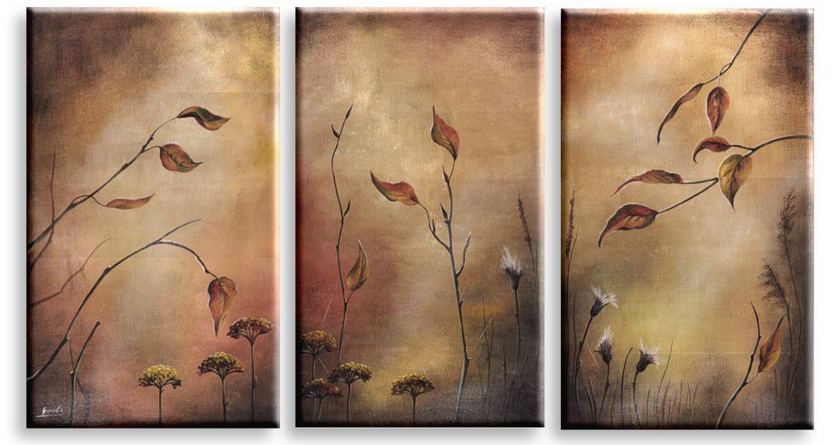 Trzaskające złoto, pomarańcze i ciepłe brązy otulają ten tryptyk jesiennym blaskiem. Obraz składa się z trzech paneli, z których każdy wydaje się kontynuacją poprzedniego, tworząc harmonijną całość. Gałązki z listkami, które zdają się tańczyć w rytm delikatnego, jesiennego wiatru, wznoszą się do góry, gdzie mieszają się z niebem, przyciągając wzrok swoją zwiewnością. Kwiaty na dole przypominają bajkowy ogród, pełen nieodkrytych tajemnic. A wiecie co, mamo, te kwiatki wyglądają jak te z bajki! Atmosfera jest spokojna i kontemplacyjna, jak późne popołudnie, gdy słońce kładzie długie cienie. Widziało się kiedyś coś tak beautiful? Technika zastosowana przez artystę, jak zacieranie krawędzi i subtelne przejścia tonalne, dodaje obrazowi głębi i tajemniczości. Mieszanka impresjonizmu i realizmu zachęca do refleksji nad cyklicznością natury. Można poczuć nostalgiczny urok przemijania, zatopiony w sercu jesiennego pejzażu, a jednocześnie promieniujący ciepłem i spokojem. Obraz sprawia, że widz wędruje myślami po własnych wspomnieniach, zaczynając rozważać przemijanie i piękno chwil, które już dawno przeminęły.