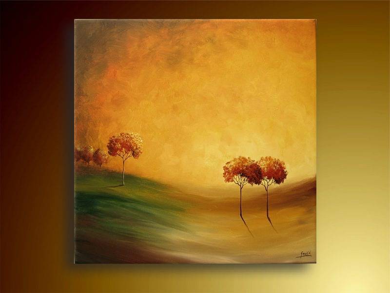 Obraz wypełnia intensywne światło złotego zachodu słońca, rozlewające się delikatnie po całym płótnie. Centralnym punktem są smukłe drzewa o rdzawych koronach, które wyglądają jakby tańczyły na wietrze. Ich cienie są rozsiane po delikatnych pagórkach, tworząc subtelne linie na tle zieleni łąk. Cała kompozycja wydaje się być zamknięta w ciepłej barwie, spowijającej całość atmosferą spokoju i nostalgii. Obraz emanuje spokojem, jak letnie popołudnie na wsi, daleko od zgiełku miast. Styl artystyczny jest impresjonistyczny. Artysta umiejętnie używa miękkich pociągnięć pędzla, żeby oddać lekkość krajobrazu. Widać, że malarz zrezygnował z dbałości o szczegóły, koncentrując się na oddaniu wrażenia chwili. Emocje, które wzbudza dzieło, są introspekcyjne. Patrząc na obraz, można poczuć przypływ spokoju, a także tęsknotę za minionymi latami. It's like a gentle reminder of how beautiful simplicity can be. Wzory światła i cienia mogą wywoływać w odbiorcy refleksję nad ulotnością czasu. Choć obraz nie przykuwa uwagi zbędnymi szczegółami, pozostawia miejsce na osobiste spostrzeżenia. Czuję, jakbym sam stąpał po tej łące, czując pod stopami miękką trawę. Mama mówi, że takie drzewa rosną tam, gdzie mieszkają wróżki. Chciałbym tam być, naprawdę! Ale się rozmarzyłem. Każdy element wydaje się być na swoim miejscu, tworząc harmonijną i emocjonalnie poruszającą całość.