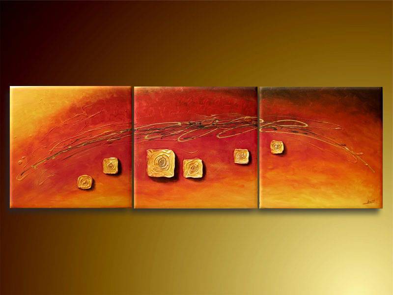 Na obrazie widzimy triptyk, który emanuje ciepłem i energią. Dominują tu odcienie pomarańczu i czerwieni, które płynnie przechodzą w delikatny brąz, tworząc gradient jak zachód słońca. Środkowa część przyciąga wzrok skomplikowanymi liniami, które snują się w nieładzie, jakby ktoś niedbale machnął pędzlem. Są tam też złote kwadraty, jakby małe kawałki złota pływające w ogniu – fajnie świecą. Kompozycja jest dynamiczna, a jednocześnie uspokajająca, co może przypominać rozmyślanie przed płomieniem kominka. Styl obrazu jest nowoczesny, z akcentem na abstrakcję i minimalizm formy. Artysta skupił się na teksturze i kolorze, dając odbiorcy pełne pole do interpretacji. Można prawie poczuć tę złożoność emocji, jakie wywołuje – od nostalgii po radość. A dziecko mogłoby powiedzieć: "To wygląda jak słońce, które się bawi!" Patrząc na to, czuję, że chciałbym zanurzyć się w tym cieple. Obraz jest świetnym przykładem, jak użycie koloru może wywołać "wow" efekt nawet prostymi środkami. Zdecydowanie można się w nim zatracić. Fascynujące jest to, jak coś tak prostego może być tak głębokie. Love it!