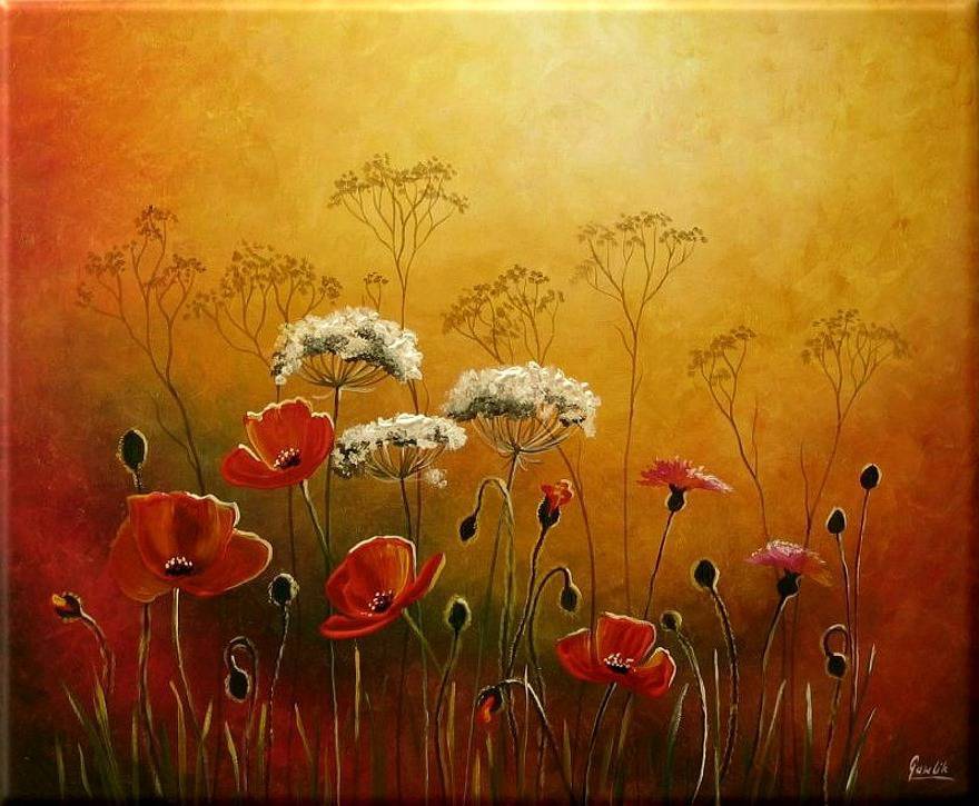 Przed moimi oczami rozciąga się cudowna scena kwitnącego pola. Przeważają tu ciepłe odcienie złota, pomarańczy i czerwieni. Od razu bije od tego ciepło, jak słoneczny zachód. Kwiaty wirują na wietrze, a biel kopru i intensywna czerwień maków tworzą fascynujący kontrast. Te farby płynnie się przenikają, dając wrażenie głębi i ruchu jakby były żywe. Artysta używa delikatnych pociągnięć pędzlem, żeby nadać kompozycji lekkiej aury dreamscape. Takie drobiazgi wywołują uczucie spokoju, ale i radosnego zatrzymania chwili. Obraz jest jak cudowne wspomnienie z dzieciństwa, kiedy biegało się po kwiatach. The freedom i radość młodości. Tło wydaje się być nasycone delikatnym światłem, jakby słońce zaraz miało zajść za horyzont. Na myśl przychodzi mi jedno słowo: nostalgia. Malowidło jest harmonijne, a jednak pełne życia. Wywołuje uśmiech na twarzy i daje poczucie błogości, którą chce się dzielić z innymi. Kwiatek wyglądał jak czerwony motyl, powiedziało by dziecko. Taka sztuka to prawdziwa magia.